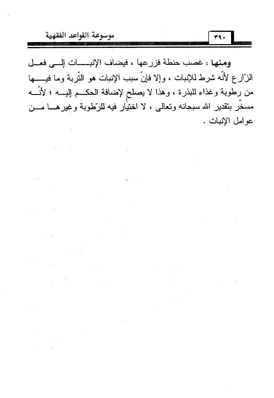 ومنها: غصب حنطة فزرعها، فيضاف الإنبات إلى فعل الزّارع لأنّه شرط للإنبات، وإلا فإنّ سبب الإنبات هو التّربة وما فيها من رطوبة وغذاء للبذرة، وهذا لا يصلح لإضافة الحكم إليه؛ لأنّه مسخّر بتقدير الله سبحانه وتعالى، لا اختيار فيه للرّطوبة وغيرها من عوامل الإنبات.