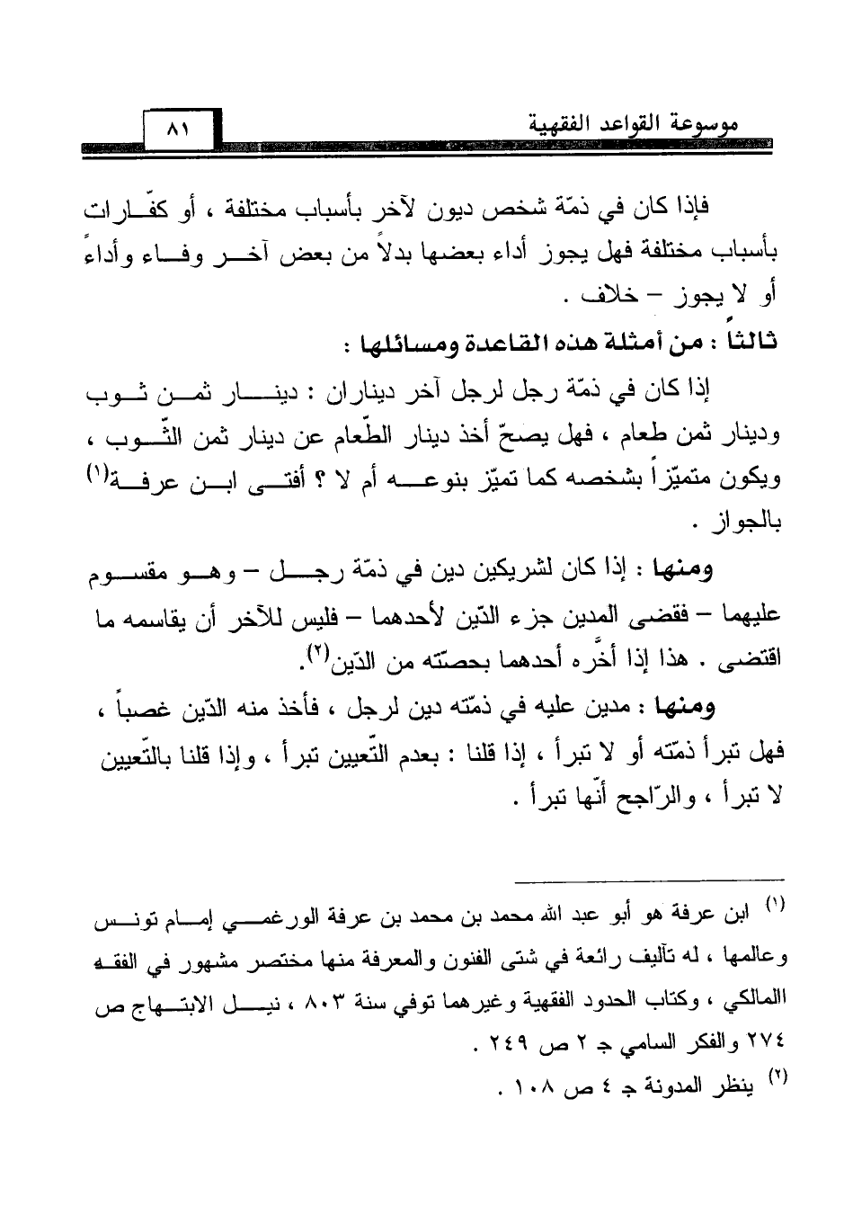 (¬1) ابن عرفة هو أبو عبد الله محمَّد بن محمَّد بن عرفة الورغمي إمام تونس وعالمها، له تآليف رائعة في شتى الفنون والمعرفة منها مختصر مشهور في الفقه المالكي، وكتاب الحدود الفقهية وغيرهما توفي سنه 803، نيل الابتهاج ص 274 والفكر السامي جـ 2 ص 249.