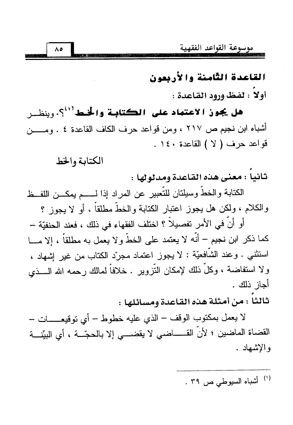 هل يجوز الاعتماد على الكتابة والخط (¬1)؟. وينظر أشباه ابن نجيم ص 217، ومن قواعد حرف الكاف القاعدة 4. ومن قواعد حرف (لا) القاعدة 140.