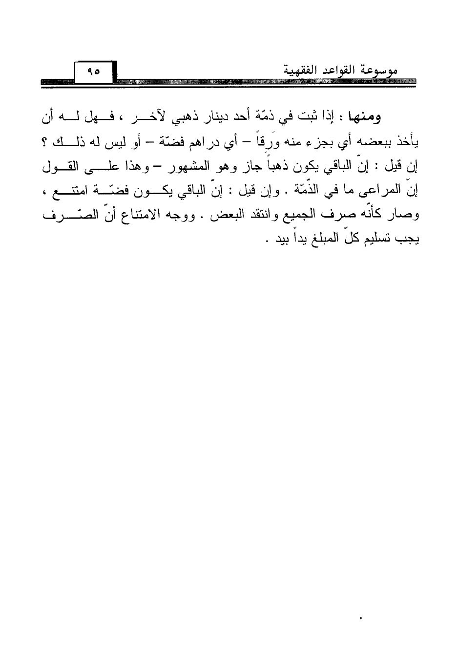 ومنها: إذا ثبت في ذمّة أحد دينار ذهبي لآخر، فهل له أن يأخذ بعضه أي بجزء منه وَرِقاً - أي دراهم فضّة - أو ليس له ذلك؟ إن قيل: إنّ الباقي يكون ذهباً جاز وهو المشهور - وهذا على القول إنّ المراعى ما في الذّمّة. وإن قيل: إنّ الباقي يكون فضّة امتنع، وصار كأنّه صرف الجميع وانتقد البعض. ووجه الامتناع أنّ الصّرف يجب تسليم كلّ المبلغ يداً بيد.
