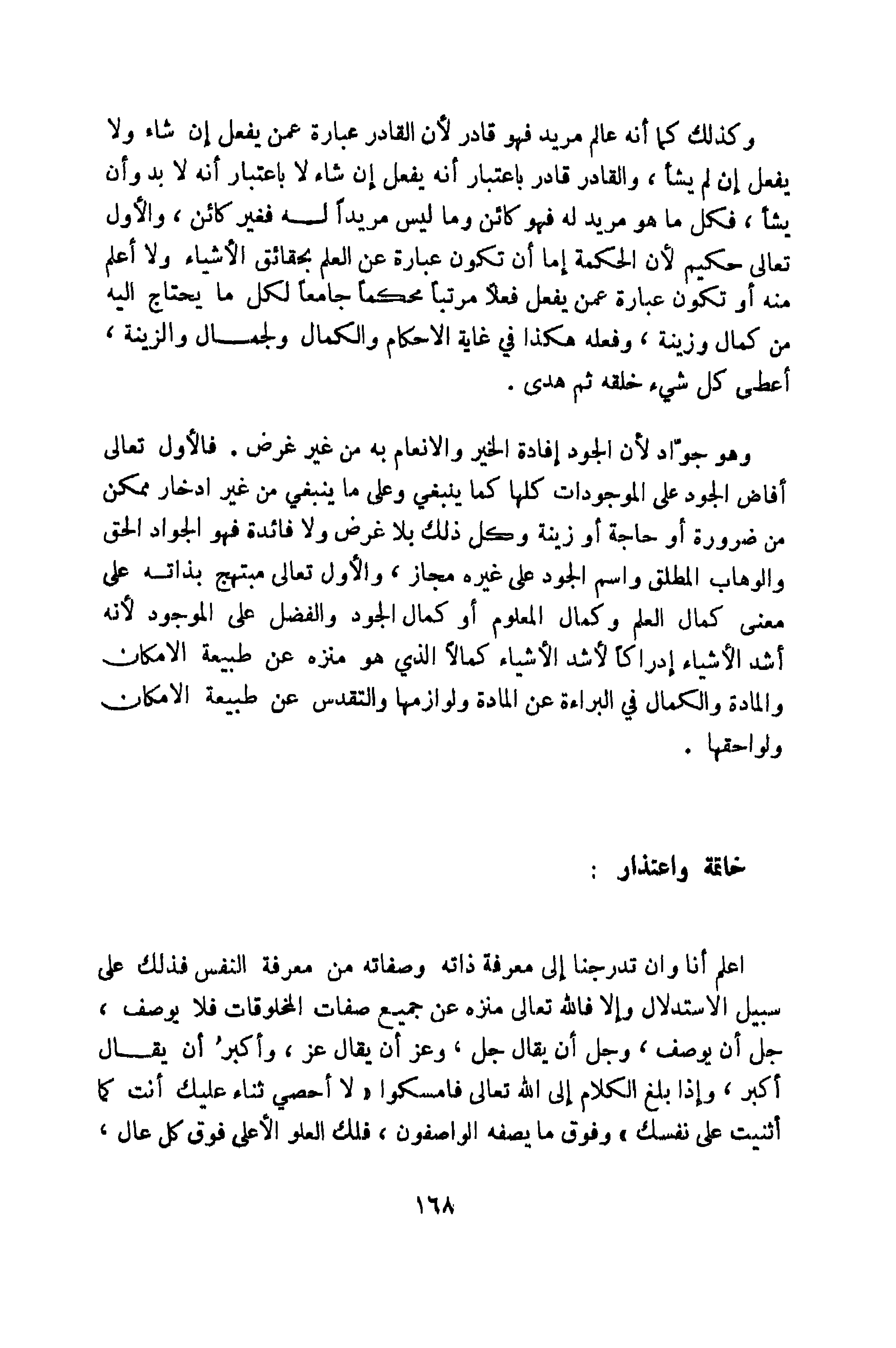 وَكَذَلِكَ كَمَا أَنه عَالم مُرِيد فَهُوَ قَادر لِأَن الْقَادِر عبارَة عَمَّن يفعل إِن شَاءَ وَلَا يفعل إِن لم يَشَأْ والقادر قَادر بِاعْتِبَار أَنه يفعل إِن شَاءَ لَا بِاعْتِبَار أَنه لَا بُد وَأَن يَشَأْ فَكل مَا هُوَ مُرِيد لَهُ فَهُوَ كَائِن وَمَا لَيْسَ مرِيدا لَهُ فَغير كَائِن وَالْأول تَعَالَى حَكِيم لِأَن الْحِكْمَة إِمَّا أَن تكون عبارَة عَن الْعلم بحقائق الْأَشْيَاء وَلَا أعلم مِنْهُ أوتكون عبارَة عَمَّن يفعل فعلا مُرَتبا محكما جَامعا لكل مَا يحْتَاج اليه من كَمَال وزينة وَفعله هَكَذَا فِي غَايَة الاحكام والكمال ولجمال والزينة أعْطى كل شَيْء خلقه ثمَّ هدى