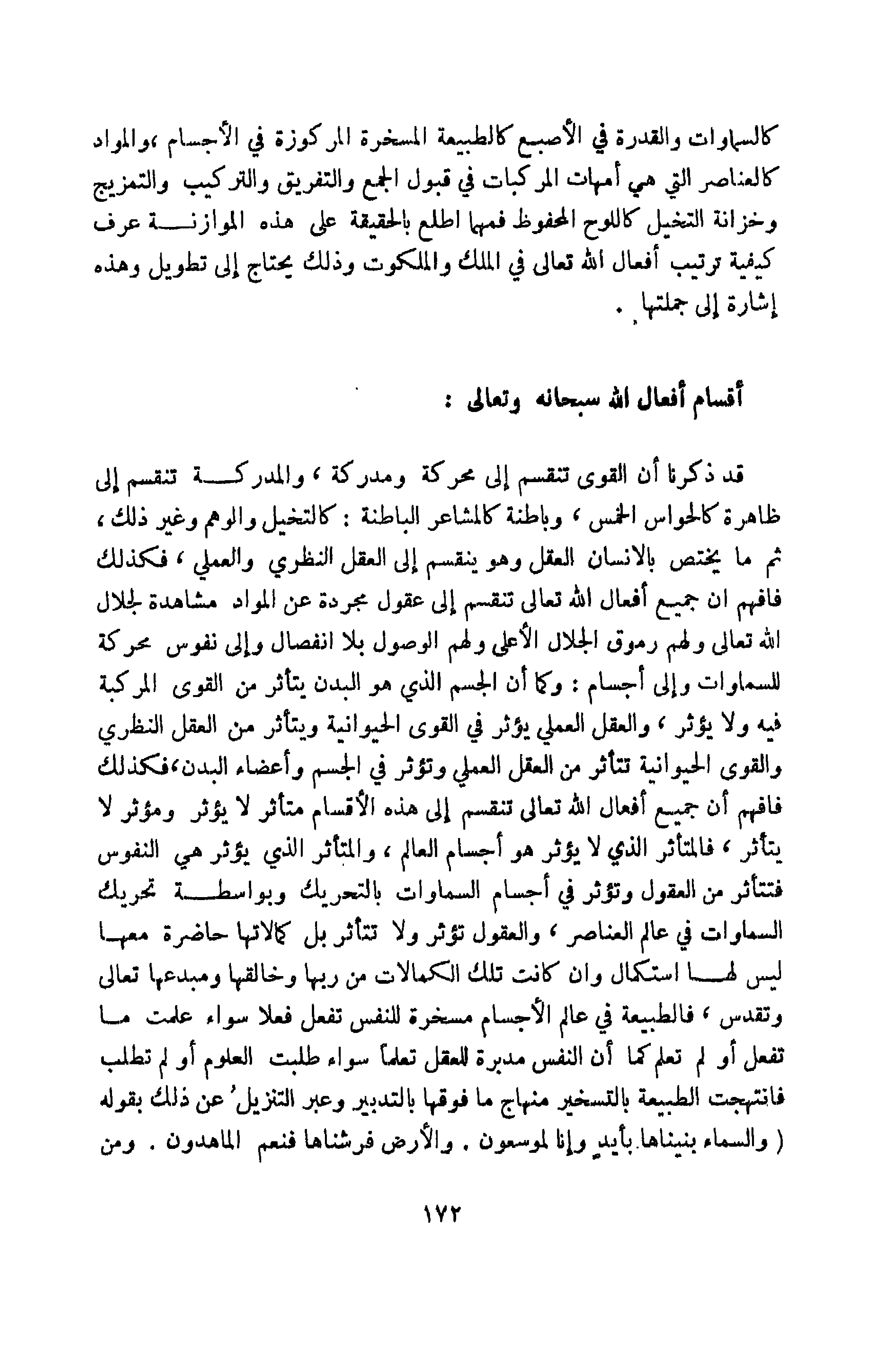 قد ذكرنَا أَن القوى تَنْقَسِم إِلَى محركة ومدركة والمدركة تَنْقَسِم إِلَى ظَاهِرَة كالحواس الْخمس وباطنة كالمشاعر الْبَاطِنَة كالتخيل وَالوهم وَغير ذَلِك ثمَّ مَا يخْتَص بالانسان الْعقل وَهُوَ يَنْقَسِم إِلَى الْعقل النظري والعملي فَكَذَلِك فَافْهَم ان جَمِيع أَفعَال الله تَعَالَى تَنْقَسِم إِلَى عقول مُجَرّدَة عَن الْموَاد مُشَاهدَة لجلال الله تَعَالَى وَلَهُم رموق الْجلَال الْأَعْلَى وَلَهُم الْوُصُول بِلَا انْفِصَال وَإِلَى نفوس محركة للسماوات وَإِلَى أجسام وكما أَن الْجِسْم الَّذِي هُوَ الْبدن يتأثر من القوى المركبة فِيهِ وَلَا يُؤثر وَالْعقل العملي يُؤثر فِي القوى الحيوانية ويتأثر من الْعقل النظري والقوى الحيوانية تتأثر من الْعقل العملي وتؤثر فِي الْجِسْم وأعضاء الْبدن فَكَذَلِك فَافْهَم أَن جَمِيع أَفعَال الله تَعَالَى تَنْقَسِم إِلَى هَذِه الْأَقْسَام متأثر لَا يُؤثر ومؤثر لَا يتأثر فالمتأثر الَّذِي لَا يُؤثر هُوَ أجسام الْعَالم والمتأثر الَّذِي يُؤثر هِيَ النُّفُوس فتتأثر من الْعُقُول وتؤثر فِي اجسام السَّمَاوَات بِالتَّحْرِيكِ وبواسطة تَحْرِيك السَّمَاوَات فِي عَالم العناصر والعقول تُؤثر وَلَا تتاثر بل كمالاتها حَاضِرَة مَعهَا لَيْسَ لَهَا استكمال وان كَانَت تِلْكَ الكمالات من رَبهَا وخالقها ومبدعها تَعَالَى وتقدس فالطبيعة فِي عَالم الْأَجْسَام مسخرة للنَّفس تفعل فعلا سَوَاء علمت مَا تفعل أَو لم تعلم كَمَا أَن النَّفس مُدبرَة لِلْعَقْلِ تعلما سَوَاء طلبت الْعُلُوم أَو لم تطلب فانتهجت الطبيعة بالتسخير منهاج مَا فَوْقهَا بِالتَّدْبِيرِ وَعبر التَّنْزِيل عَن ذَلِك بقوله {وَالسَّمَاء بنيناها بأيد وَإِنَّا لموسعون وَالْأَرْض فرشناها فَنعم الماهدون وَمن}