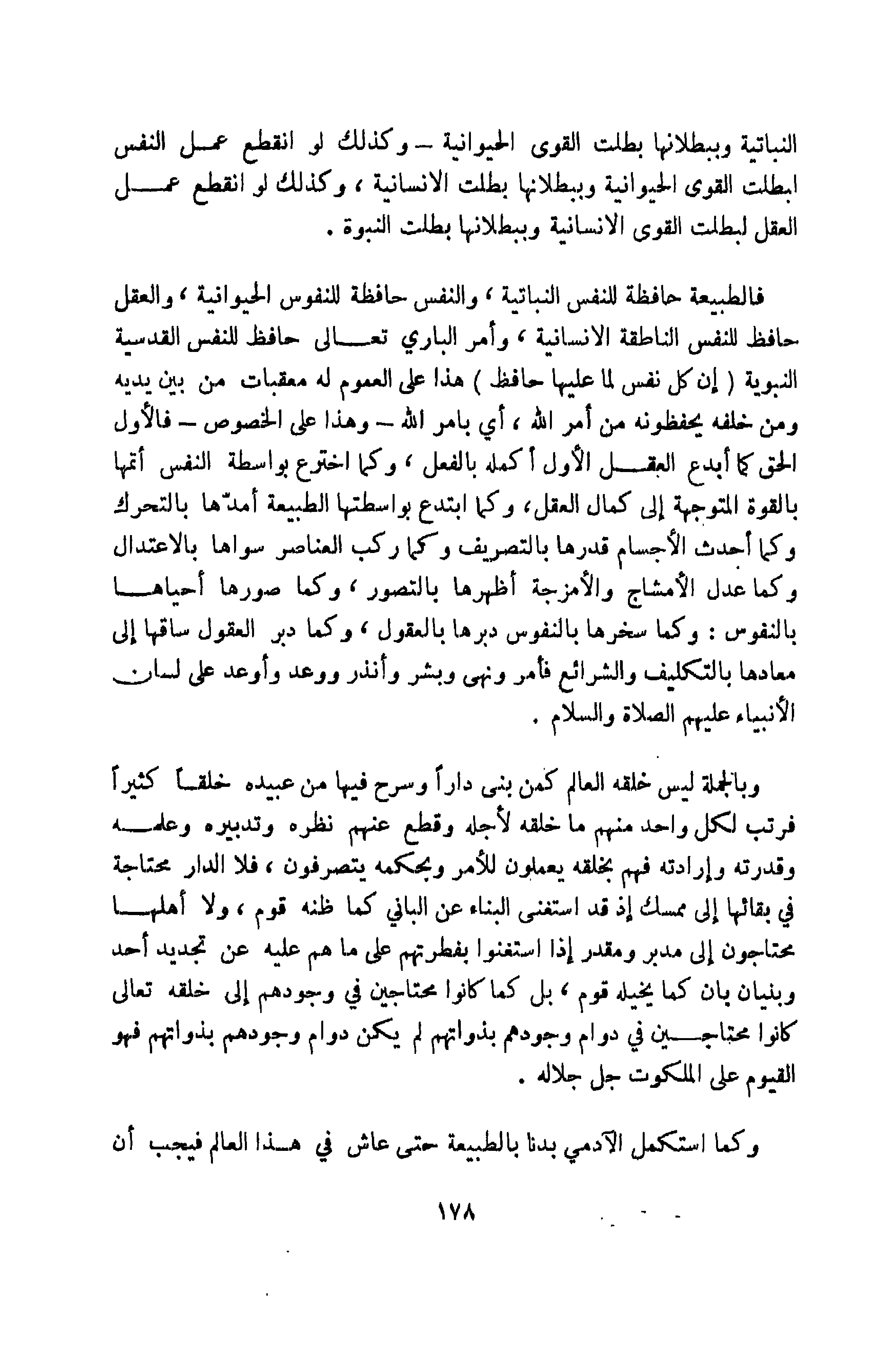 فالطبيعة حافظة للنَّفس النباتية وَالنَّفس حافظة للنفوس الحيوانية وَالْعقل حَافظ للنَّفس الناطقة الانسانية وَأمر الْبَارِي تَعَالَى حَافظ للنَّفس القدسية النَّبَوِيَّة إِن كل نفس عَلَيْهَا حَافظ هَذَا على الْعُمُوم {لَهُ مُعَقِّبَات من بَين يَدَيْهِ وَمن خَلفه يَحْفَظُونَهُ من أَمر الله} أَي بِأَمْر الله وَهَذَا على الْخُصُوص فَالْأول الْحق كَمَا أبدع الْعقل الأول أكمله بِالْفِعْلِ وكما اخترع بِوَاسِطَة النَّفس أتمهَا بِالْقُوَّةِ المتوجهة إِلَى كَمَال الْعقل وكما ابتدع بواسطتها الطبيعة أمدها بالتحرك وكما أحدث الْأَجْسَام قدرهَا بالتصريف وكما ركب العناصر سواهَا بالاعتدال وكما عدل الأمشاج والأمزجة أظهرها بالتصور وكما صورها أَحْيَاهَا بالنفوس وكما سخرها بالنفوس دبرهَا بالعقول وكما دبر الْعُقُول سَاقهَا إِلَى معادها بالتكليف والشرائع فَأمر وَنهى وَبشر وأنذر ووعد وأوعد على لِسَان الْأَنْبِيَاء عَلَيْهِم الصَّلَاة وَالسَّلَام