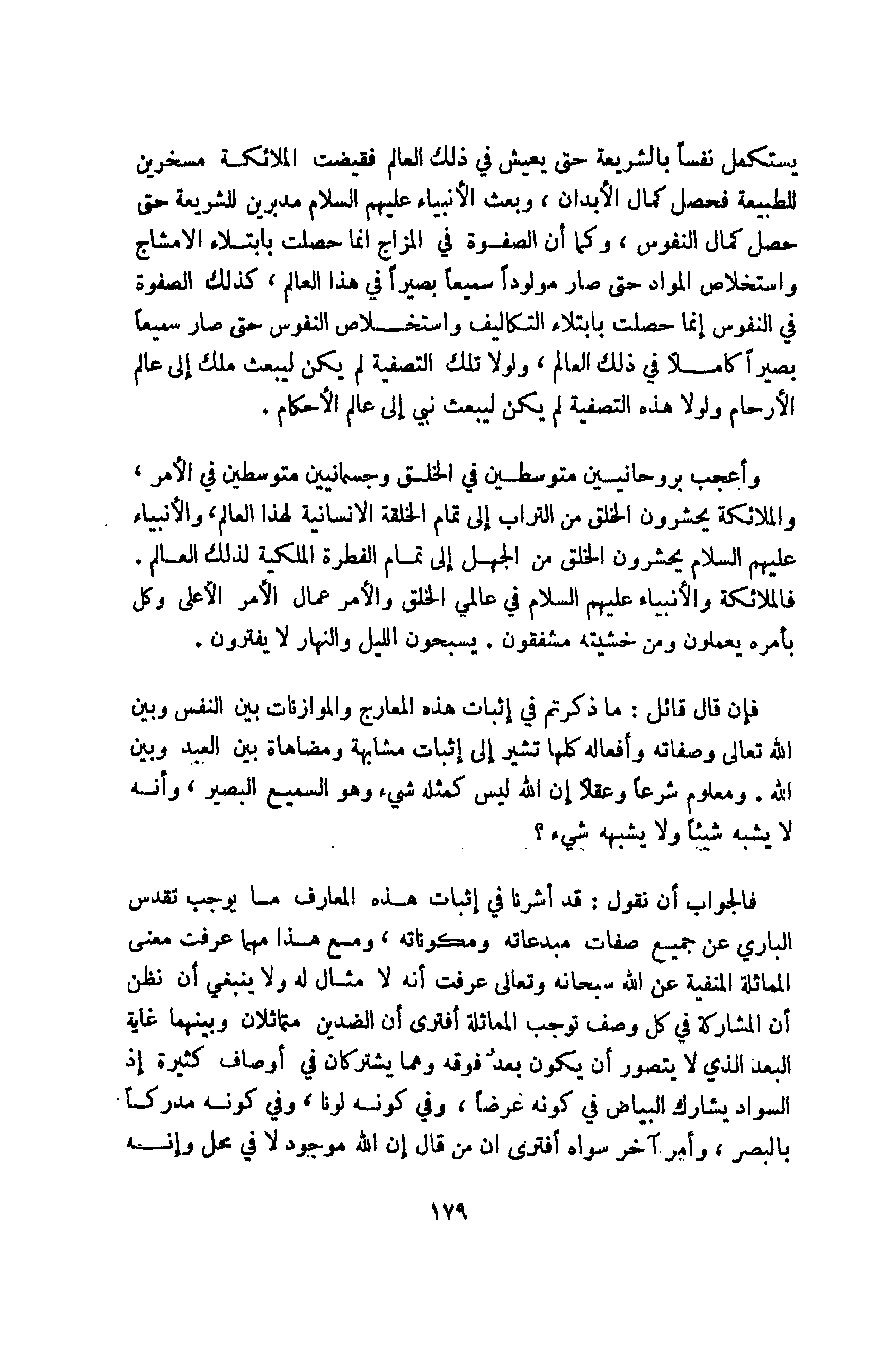 فَإِن قَالَ قَائِل مَا ذكرْتُمْ فِي إِثْبَات هَذِه المعارج والموازنات بَين النَّفس وَبَين الله تَعَالَى وَصِفَاته وأفعاله كلهَا تُشِير إِلَى إِثْبَات مشابهة ومضاهاة بَين العَبْد وَبَين الله وَمَعْلُوم شرعا وعقلا إِن الله لَيْسَ كمثله شَيْء وَهُوَ السَّمِيع الْبَصِير وَأَنه لَا يشبه شَيْئا وَلَا يُشبههُ شَيْء