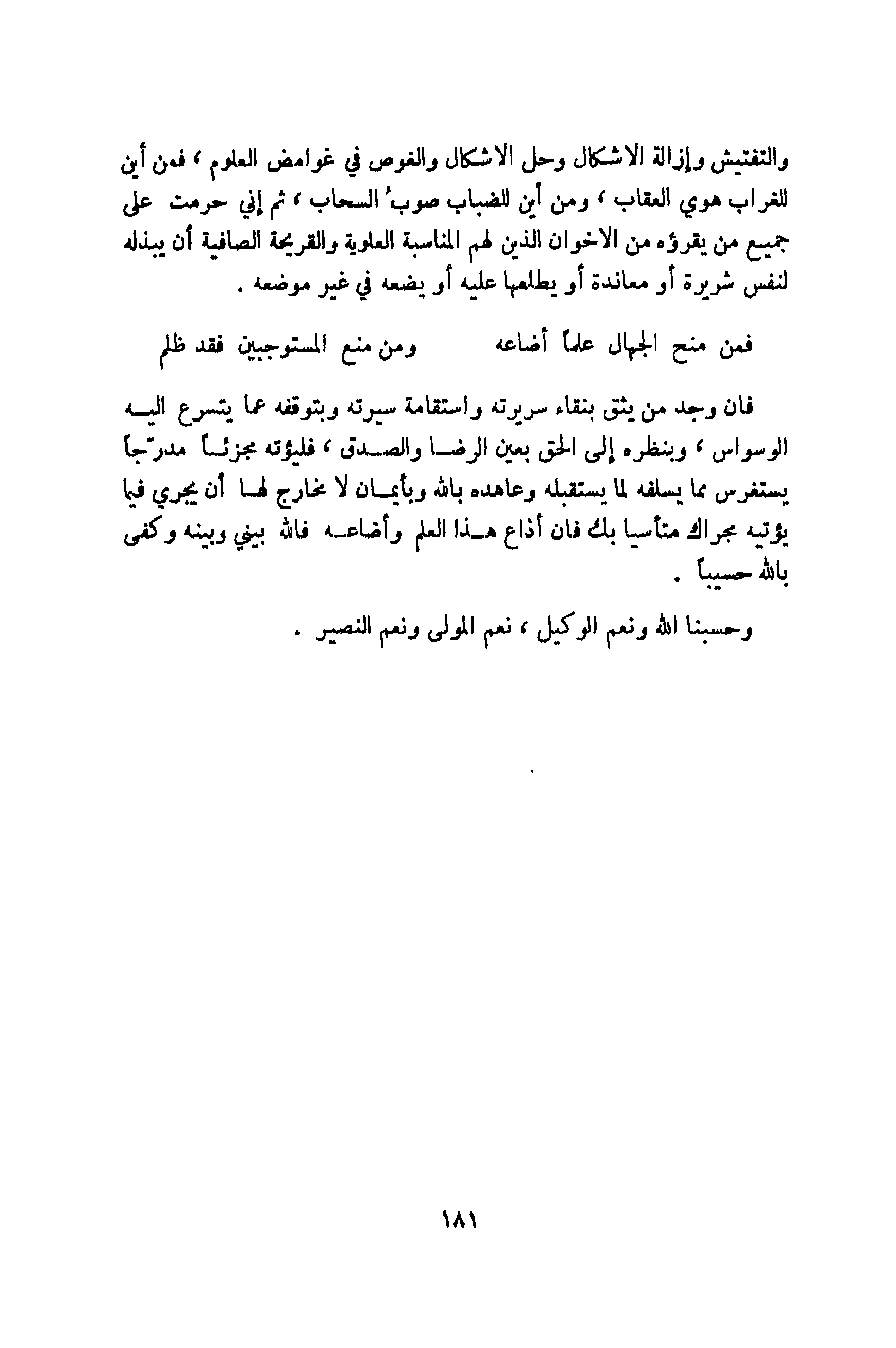 والتفتيش وَإِزَالَة الاشكال وَحل الاشكال والغوص فِي غوامض الْعُلُوم فَمن أَيْن للغراب هوي الْعقَاب وَمن أَيْن للضباب صوب السَّحَاب ثمَّ إِنِّي حرمت على جَمِيع من يَقْرَؤُهُ من الاخوان الَّذين لَهُم الْمُنَاسبَة العلوية والقريحة الصافية أَن يبذله لنَفس شريرة أَو معاندة أَو يطْلعهَا عَلَيْهِ أويضعه فِي غير مَوْضِعه