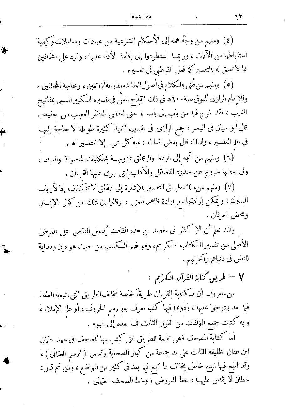(5) ومنهم من عنى بالكلام فى أصول العقائد ومقارعة الزائغين، ومحاجة المخالفين وللإمام الرازي المتوفى سنة 610 هـ فى ذلك القدح المعلّى فى تفسيره الكبير المسمى بمفاتيح الغيب، فقد خرج فيه من باب إلى باب، حتى ليقضى الناظر العجب من صنيعه. ومن ثمّ قال أبو حيان الأندلسى فى البحر المحيط: جمع الرازي فى تفسيره أشياء كثيرة طويلة لا حاجة إليها فى علم التفسير، ولذلك قال بعض العلماء: تفسيره فيه كل شىء إلا التفسير اهـ.