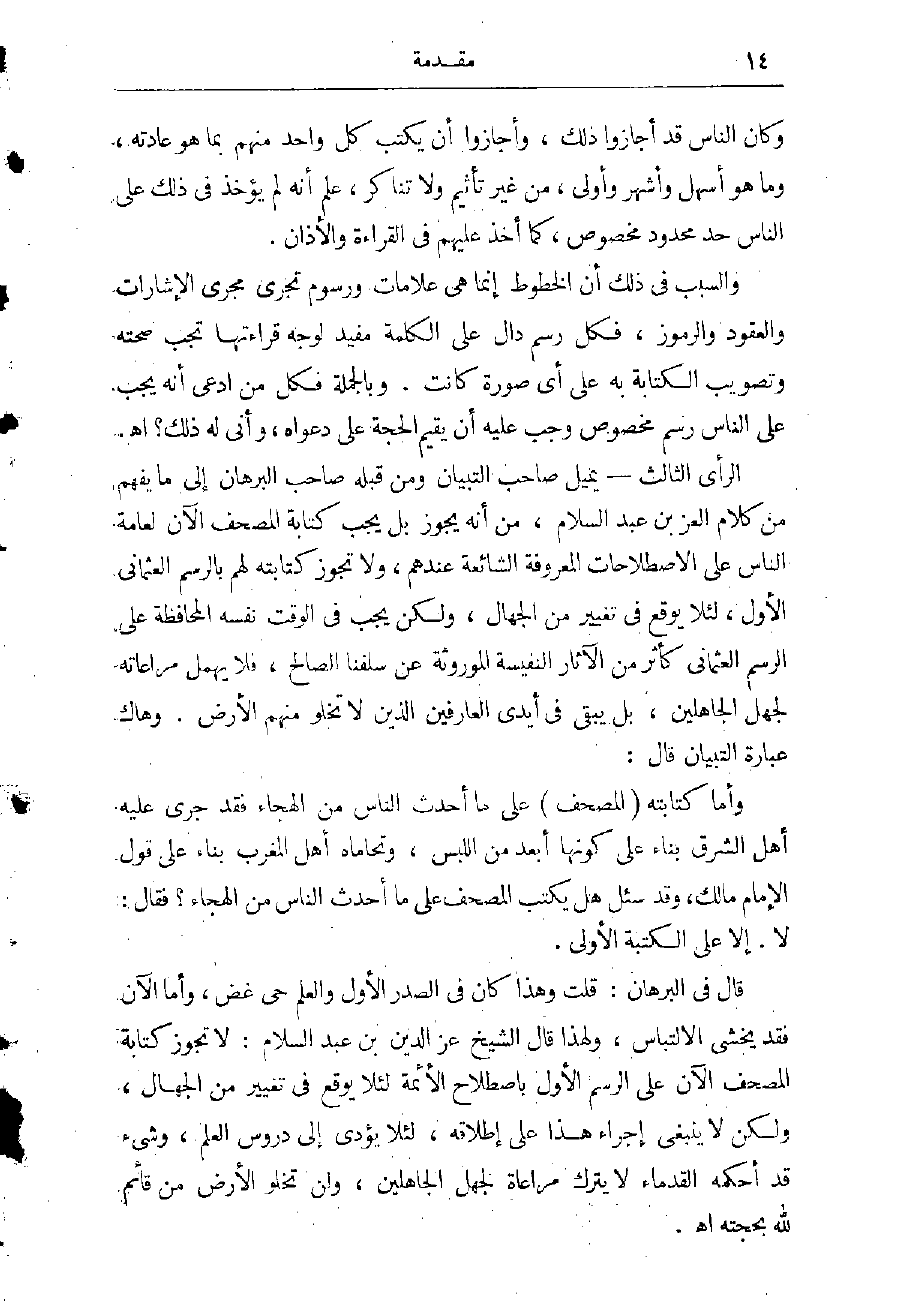 إذ وجوب ذلك لا يدرك إلا بالسمع والتوقيف، وليس فى نصوص الكتاب ولا مفهومه أن رسم القرآن وضبطه لا يجوز إلا على وجه مخصوص وحدّ محدود لا يجوز تجاوزه، ولا فى نص السنة ما يوجب ذلك ويدل عليه، ولا في إجماع الأمة ما يوجب ذلك، ولا دلت عليه القياسات الشرعية، بل السنة دلت على جواز رسمه بأى وجه سهل، لأن رسول الله صلى الله عليه وسلم كان يأمر برسمه ولم يبين لهم وجها معينا، ولا نهى عن كتابته بغيره.