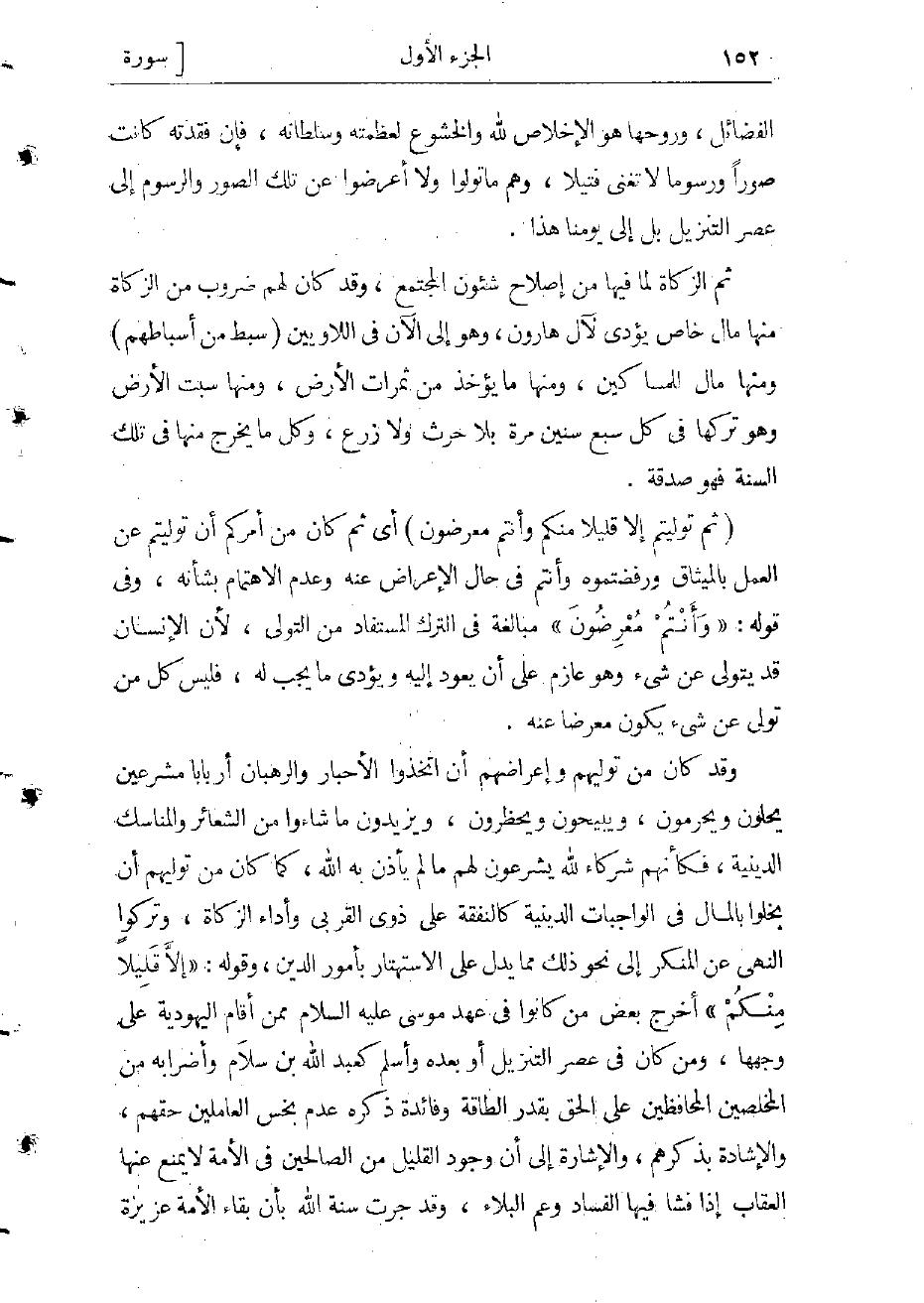 قال الأستاذ الإمام محمد عبده: من شاء أن يرى نسخة مما كان عليه اليهود من قبل فلينظر فيما بين يديه فانه يراها واضحة جلية، يرى كتبا ألّفت في عقائد الدين وأحكامه، حرّفت فيها مقاصده وحوّلت إلى ما يغرّ الناس ويمنيهم ويفسد عليهم دينهم ويقولون هى من عند الله وما هى من عند الله، وإنما هى صادّة عن النظر في كتاب الله والاهتداء به- ولا يعمل هذا إلا أحد رجلين: رجل مارق من الدين يتعمد إفساده، ويتوخى إضلال أهله، فيلبس لباس الدين ويظهر بمظهر أهل الصلاح، يخادع الناس بذلك ليقبلوا ما يكتب ويقول، ورجل يتحرى التأويل ويستنبط الحيل، ليسهل على الناس مخالفة الشريعة ابتغاء المال والجاه اهـ.