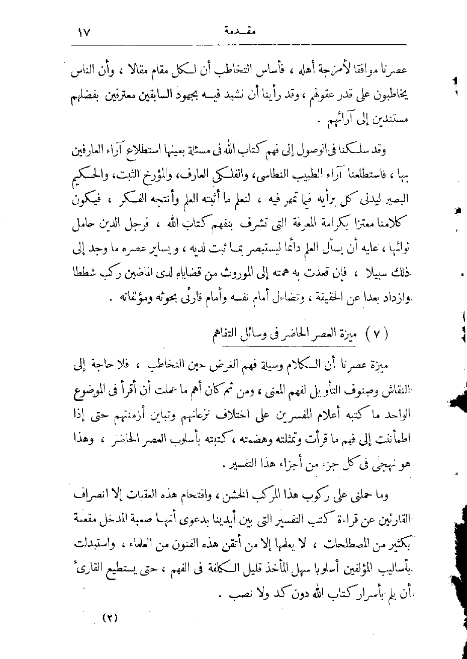 ولما كان لكل عصر طابع خاص يمتاز به عن غيره فى آداب أهله وأخلاقهم وعاداتهم وطرائق تفكيرهم- وجب على الباحثين فى هذا العصر مجاراة أهله فى كل ما نقدّم، فكان لزاما علينا أن نتلمس لونا من التفسير لكتاب الله بأسلوب عصرنا موافقا لأمزجة أهله، فأساس التخاطب أن لكل مقام مقالا، وأن الناس يخاطبون على قدر عقولهم، وقد رأينا أن نشيد فيه بجهود السابقين معترفين بفضلهم، مستندين إلى آرائهم.