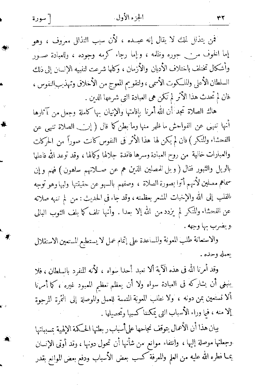 (إِيَّاكَ نَعْبُدُ وَإِيَّاكَ نَسْتَعِينُ) العبادة خضوع ينشأ عن استشعار القلب بعظمة المعبود اعتقادا بأن له سلطانا لا يدرك العقل حقيقته لأنه أعلى من أن يحيط به فكره، أو يرقى إليه إدراكه.