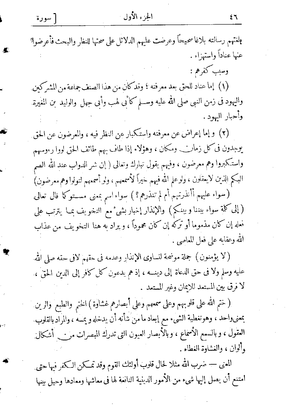 بعد أن بين سبحانه حال المتقين الذين يؤمنون بالغيب، وبما أنزل إلى الرسول صلى الله عليه وسلم وما أنزل إلى من قبله، وبين ما آل إليه أمرهم من الهداية والفلاح، أعقب هذا بشرح طائفة ثانية وهم الكفرة الفجرة، وأبان أنه قد بلغ من أمرهم فى الغواية والضلال ألا يجدى فيهم الإنذار والتبشير، وألا تؤثّر فيهم العظة والتذكير، فهم عن الصراط السوىّ ناكبون، وعن الحق معرضون، فالإنذار وعدمه سيان، فماذا ينفع النور مهما سطع، والضوء مهما ارتفع، مع من أغمض عينيه حتى لا يراه بغضا له، وعداوة لمن دعا إليه، لأن الجهل أفسد وجدانه، فأصبح لا يميز بين نور وظلمة، ولا بين نافع وضارّ.