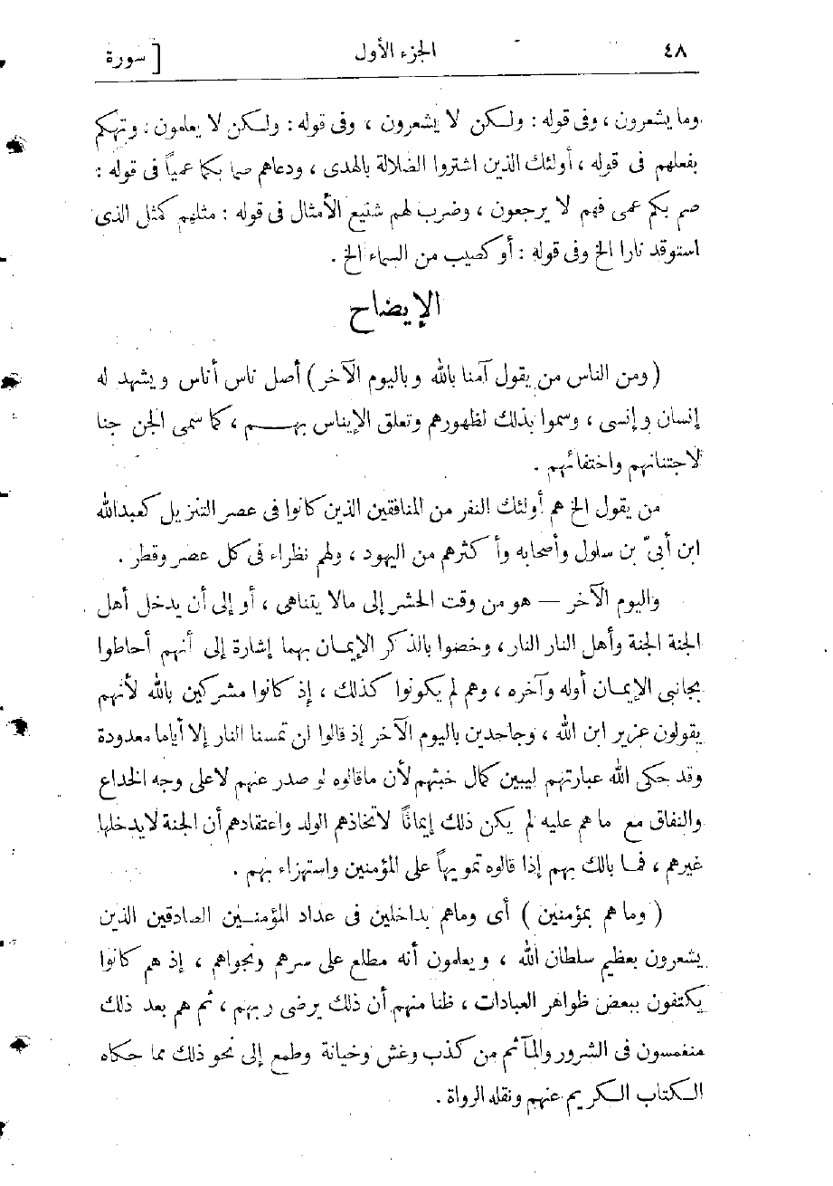 وقد وصف الله حال الذين كفروا في آيتين وحال المنافقين في ثلاث عشرة آية، نعى عليهم فيها خبثهم ومكرهم، وفضحهم، واستجهلهم، واستهزأ بهم، وتهكم بفعلهم، ودعاهم صما بكما عميا، وضرب لهم شنيع الأمثال.