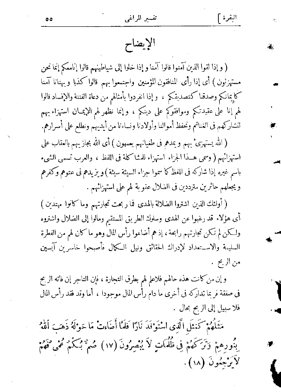 اللقاء المصادفة تقول: لقيته ولاقيته إذا صادفته واستقبلته، خلوا إما من خلوت بفلان وإلى فلان إذا انفردت به، وإما من خلا بمعنى مضى، ومنه القرون الخالية، واطلب الأمر وخلاك ذم: أي جاوزك ومضى عنك. والشيطان كل عات متمرد من الإنس والجن كما قال: (شَياطِينَ الْإِنْسِ وَالْجِنِّ يُوحِي بَعْضُهُمْ إِلى بَعْضٍ زُخْرُفَ الْقَوْلِ غُرُوراً) والاستهزاء: السخرية، تقول هزأت به واستهزأت كأجبت واستجبت وأصل المادة تفيد الخفة يقال ناقة تهزأ به: أي تسرع. يمدهم: أي يزيدهم من مدّ الجيش وأمده إذا زاد عدده وقواه. والطغيان: (بضم الطاء وكسرها) مجاوزة الحدّ فى كل شىء. والعمه: ظلمة البصيرة كالعمى في البصر وأثره الحيرة والاضطراب بحيث لا يدرى الإنسان أين يتوجه، يقال عمه فهو عمه وعامه وجماعة عمّه.