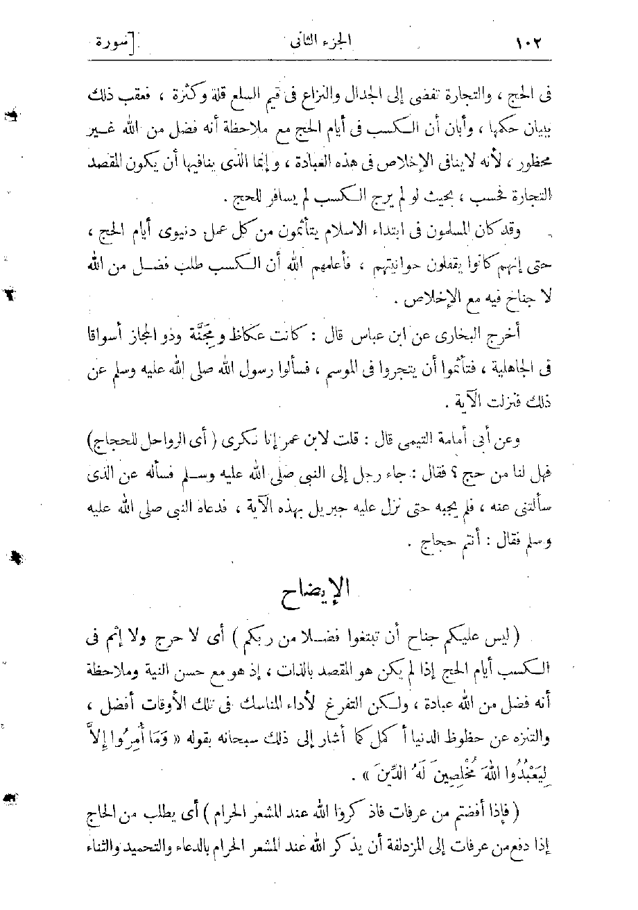 وعن أبي أمامة التيمي قال: قلت لابن عمر إنا نكري (أي الرواحل للحجاج) فهل لنا من حج؟ فقال: جاء رجل إلى النبي صلى الله عليه وسلم فسأله عن الذي سألتنى عنه، فلم يجبه حتى نزل عليه جبريل بهذه الآية، فدعاه النبي صلى الله عليه وسلم فقال: