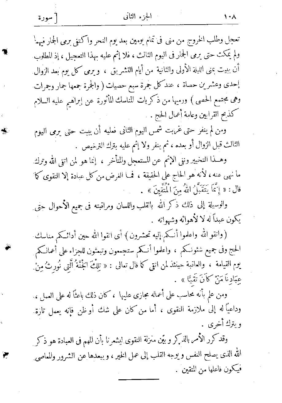 وهذا التخيير ونفى الإثم عن المستعجل والمتأخر، إنما هو لمن اتقى الله وترك ما نهى عنه، لأنه هو الحاج على الحقيقة، فما الغرض من كل عبادة إلا التقوى كما قال: