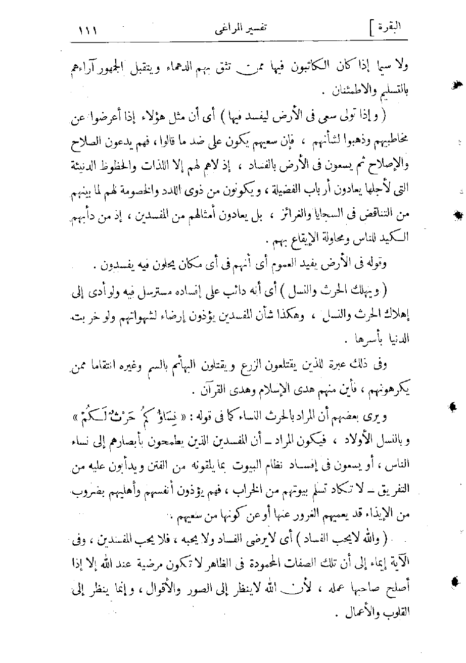 (وَيُهْلِكَ الْحَرْثَ وَالنَّسْلَ) أي إنه دائب على إفساده مسترسل فيه ولو أدى إلى إهلاك الحرث والنسل، وهكذا شأن المفسدين يؤذون إرضاء لشهواتهم ولو خربت الدنيا بأسرها.