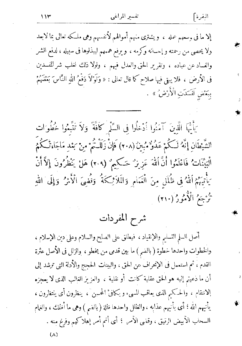 أصل السلم: التسليم والانقياد، فيطلق على الصلح والسلام وعلى دين الإسلام، والخطوات: واحدها خطوة (بالضم) ما بين قدمى من يخطو، والزلل في الأصل: عثرة القدم، ثم استعمل في الانحراف عن الحقّ، والبينات: الحجج والأدلة التي ترشد إلى أن ما دعيتم إليه هو الحق، عقلية كانت أو نقلية، والعزيز الغالب: الذي لا يعجزه الانتقام، والحكيم: الذي يعاقب المسيء ويكافئ المحسن، ينظرون: أي ينتظرون، يأتيهم الله: أي يأتيهم عذابه، والظلل: واحدها ظلة (بالضم) وهى ما أظلك، والغمام: