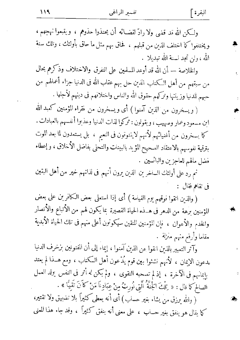 (وَالَّذِينَ اتَّقَوْا فَوْقَهُمْ يَوْمَ الْقِيامَةِ) أي إنه إذا استعلى بعض الكافرين على بعض المؤمنين برهة من الدهر في هذه الحياة القصيرة بما يكون لهم من الأتباع والأنصار والخدم والأعوان، فإن المؤمنين المتقين سيكونون أعلى منهم في تلك الحياة الأبدية مقاما وأرفع منهم منزلة.