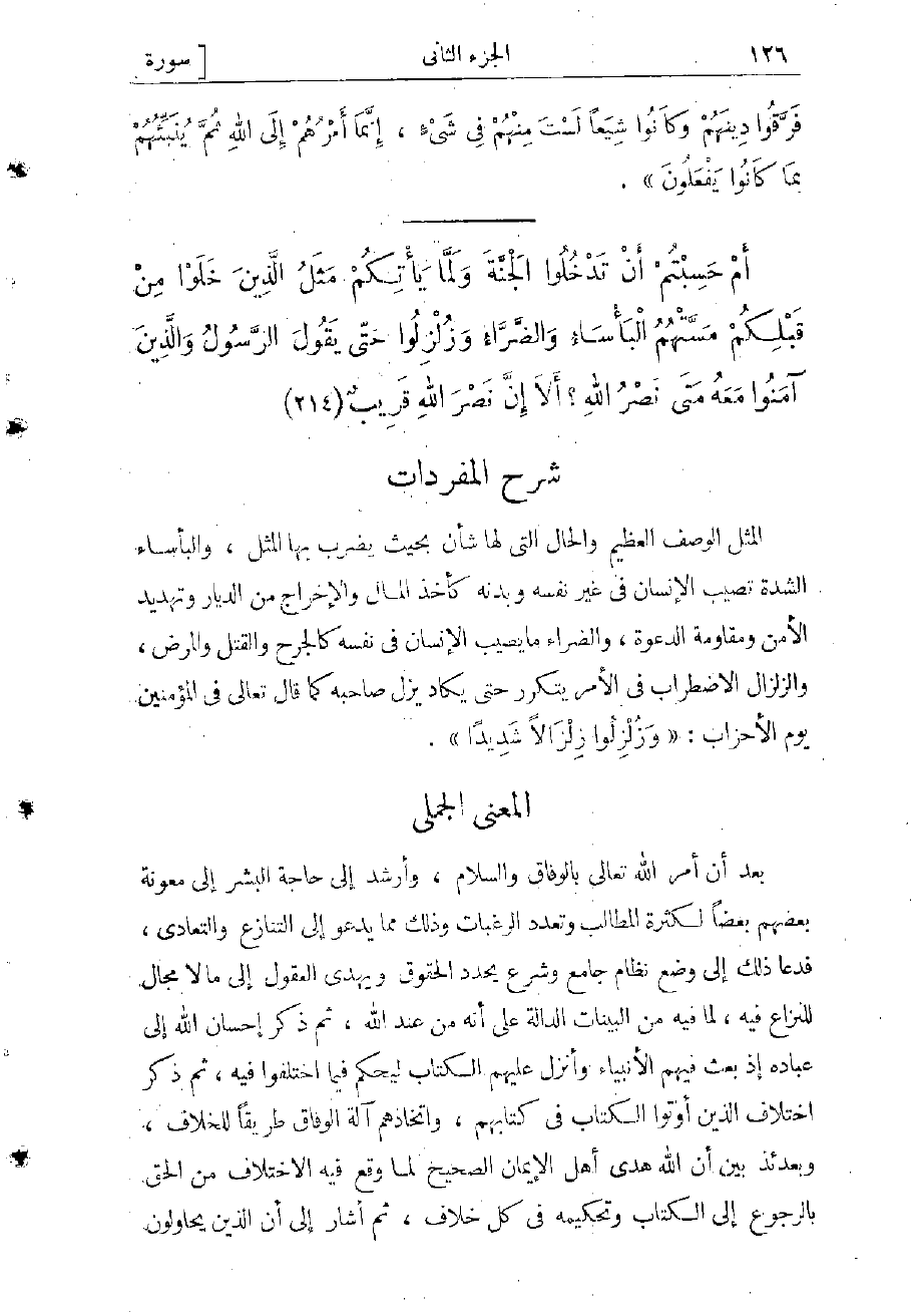 المثل: الوصف العظيم والحال التي لها شأن بحيث يضرب بها المثل، والبأساء: الشدة تصيب الإنسان في غير نفسه وبدنه، كأخذ المال، والإخراج من الديار، وتهديد الأمن، ومقاومة الدعوة، والضرّاء ما يصيب الإنسان في نفسه كالجرح والقتل والمرض، والزلزال: