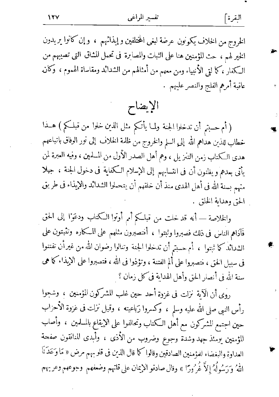 والخلاصة- إنه قد خلت من قبلكم أمم أوتوا الكتاب ودعوا إلى الحق فآذاهم الناس في ذلك فصبروا وثبتوا، أفتصبرون مثلهم على المكاره وتثبتون على الشدائد كما ثبتوا، أم حسبتم أن تدخلوا الجنة وتنالوا رضوان الله من غير أن تفتنوا في سبيل الحق، فتصبروا على ألم الفتنة، وتؤذوا في الله، فتصبروا على الإيذاء كما هى سنة الله في أنصار الحق وأهل الهداية في كل زمان؟