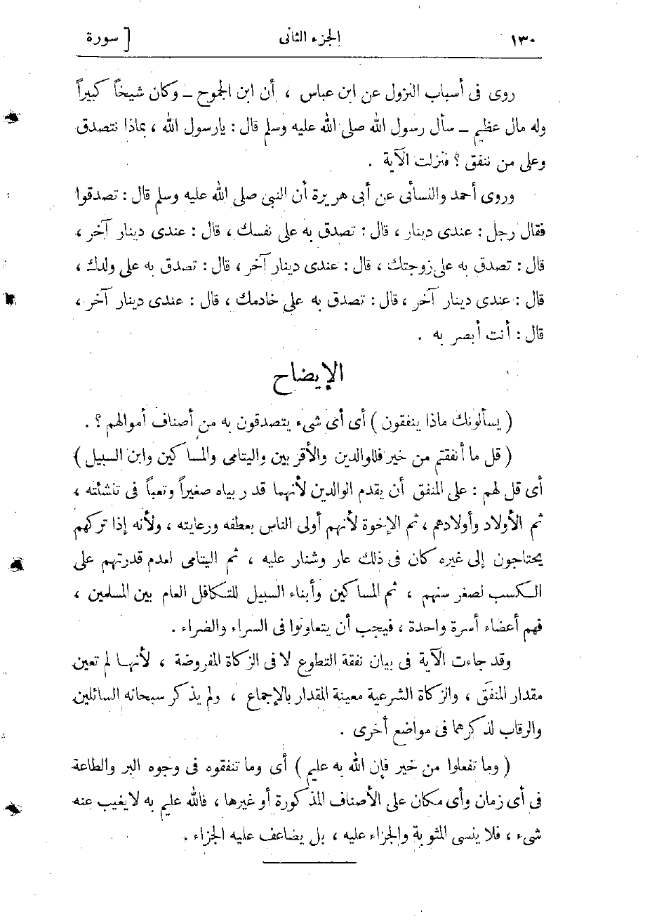 (قُلْ ما أَنْفَقْتُمْ مِنْ خَيْرٍ فَلِلْوالِدَيْنِ وَالْأَقْرَبِينَ وَالْيَتامى وَالْمَساكِينِ وَابْنِ السَّبِيلِ) أي قل لهم: على المنفق أن يقدم الوالدين لأنهما قد ربياه صغيرا وتعبا في تنشئته، ثم الأولاد وأولادهم، ثم الإخوة لأنهم أولى الناس بعطفه ورعايته، ولأنه إذا تركهم يحتاجون إلى غيره كان في ذلك عار وشنار عليه، ثم اليتامى لعدم قدرتهم على الكسب لصغر سنهم، ثم المساكين وأبناء السبيل للتكافل العام بين المسلمين، فهم أعضاء أسرة واحدة فيجب أن يتعاونوا في السرّاء والضرّاء.