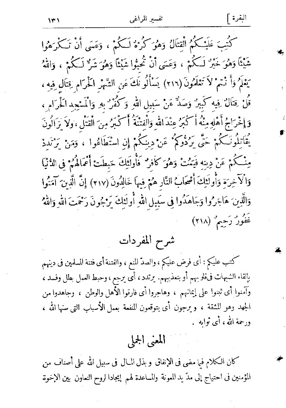 كتب عليكم: أي فرض عليكم، والصدّ المنع، والفتنة: أي فتنة المسلمين في دينهم بإلقاء الشبهات في قلوبهم أو بتعذيبهم، يرتدد: أي يرجع، وحبط العمل: بطل وفسد، وآمنوا: أي ثبتوا على إيمانهم، وهاجروا: أي فارقوا الأهل والوطن، وجاهدوا من الجهد وهو المشقة، ويرجون: أي يتوقعون المنفعة بعمل الأسباب التي سنها الله، ورحمة الله: أي ثوابه.