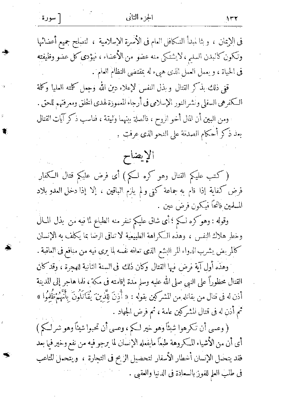 (كُتِبَ عَلَيْكُمُ الْقِتالُ وَهُوَ كُرْهٌ لَكُمْ) أي فرض عليكم قتال الكفار فرض كفاية إذا قام به جماعة كفى ولم يلزم الباقين، إلا إذا دخل العدوّ بلاد المسلمين فاتحا فيكون فرض عين.