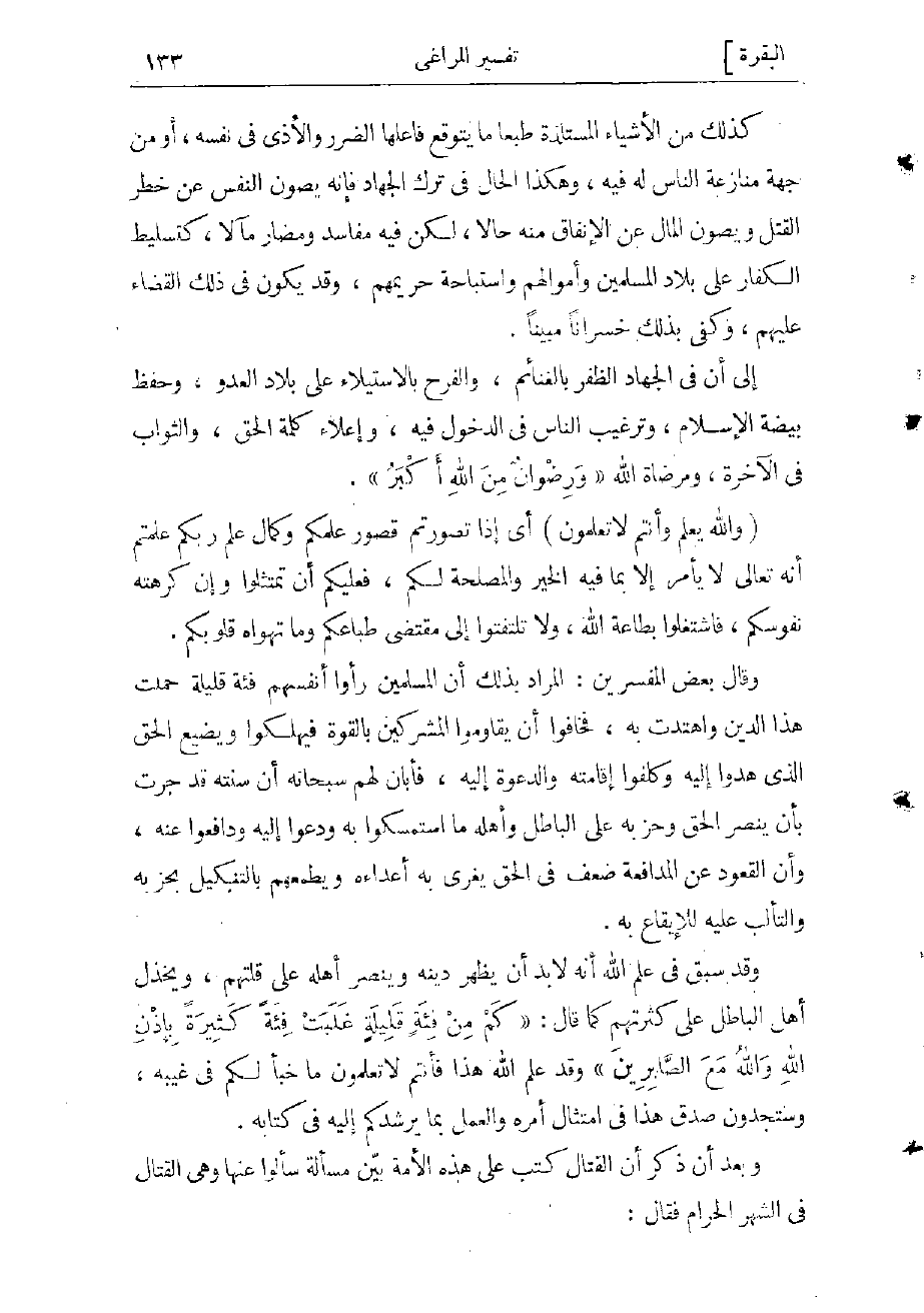 إلى أن في الجهاد الظفر بالغنائم، والفرح بالاستيلاء على بلاد العدوّ، وحفظ بيضة الإسلام، وترغيب الناس في الدخول فيه، وإعلاء كلمة الحق، والثواب في الآخرة، ومرضاة الله «وَرِضْوانٌ مِنَ اللَّهِ أَكْبَرُ» .
