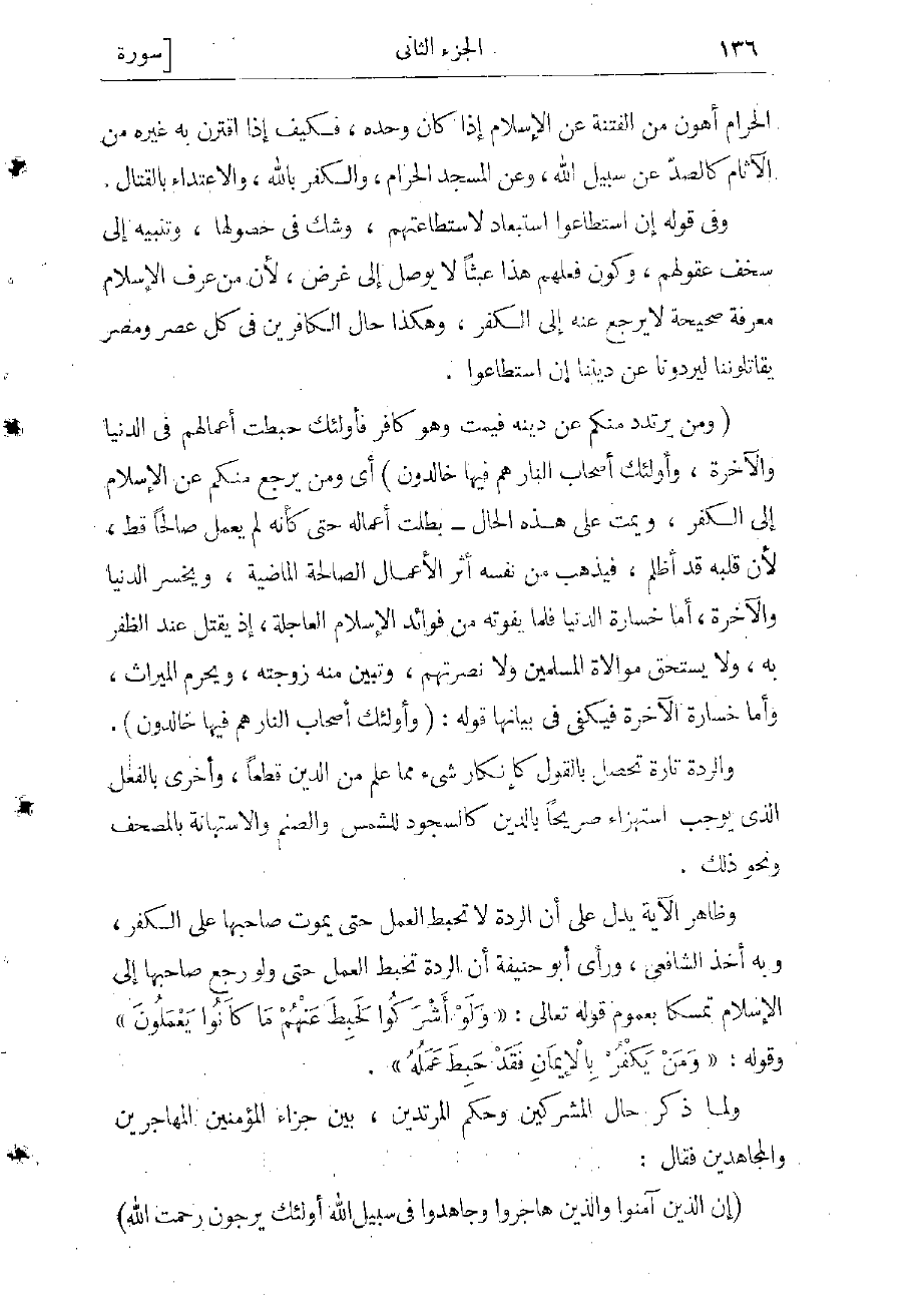 وظاهر الآية يدل على أن الردة لا تحبط العمل حتى يموت صاحبها على الكفر، وبه أخذ الشافعي، ورأى أبو حنيفة أن الردة تحبط العمل حتى ولو رجع صاحبها إلى الإسلام تمسكا بعموم قوله تعالى: «وَلَوْ أَشْرَكُوا لَحَبِطَ عَنْهُمْ ما كانُوا يَعْمَلُونَ» وقوله: