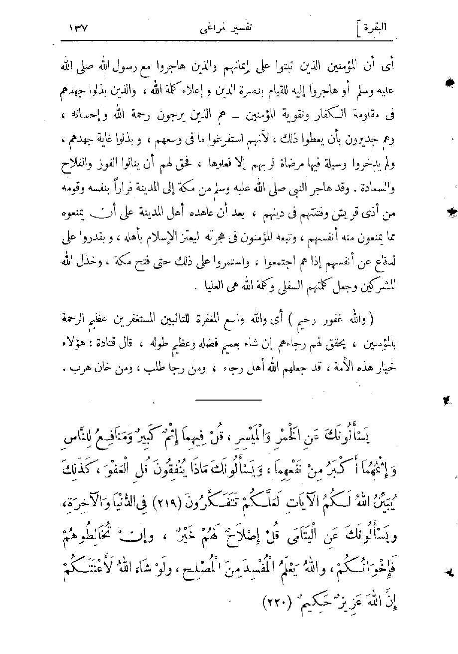 أي إن المؤمنين الذين ثبتوا على إيمانهم والذين هاجروا مع رسول الله صلى الله عليه وسلم أو هاجروا إليه للقيام بنصرة الدين وإعلاء كلمة الله، والذين بذلوا جهدهم في مقاومة الكفار وتقوية المؤمنين- هم الذين يرجون رحمة الله وإحسانه، وهم جديرون بأن يعطوا ذلك، لأنهم استفرغوا ما في وسعهم، وبذلوا غاية جهدهم، ولم يدخروا وسيلة فيها مرضاة لربهم إلا فعلوها، فحق لهم أن ينالوا الفوز والفلاح والسعادة. وقد هاجر النبي صلى الله عليه وسلم من مكة إلى المدينة فرارا بنفسه وقومه من أذى قريش وفتنتهم في دينهم، بعد أن عاهده أهل المدينة على أن يمنعوه مما يمنعون منه أنفسهم، وتبعه المؤمنون فى هجرته ليعتزّ الإسلام بأهله، ويقدروا على الدفاع عن أنفسهم إذا هم اجتمعوا، واستمروا على ذلك حتى فتح مكة، وخذل الله المشركين وجعل كلمتهم السفلى وكلمة الله هى العليا.