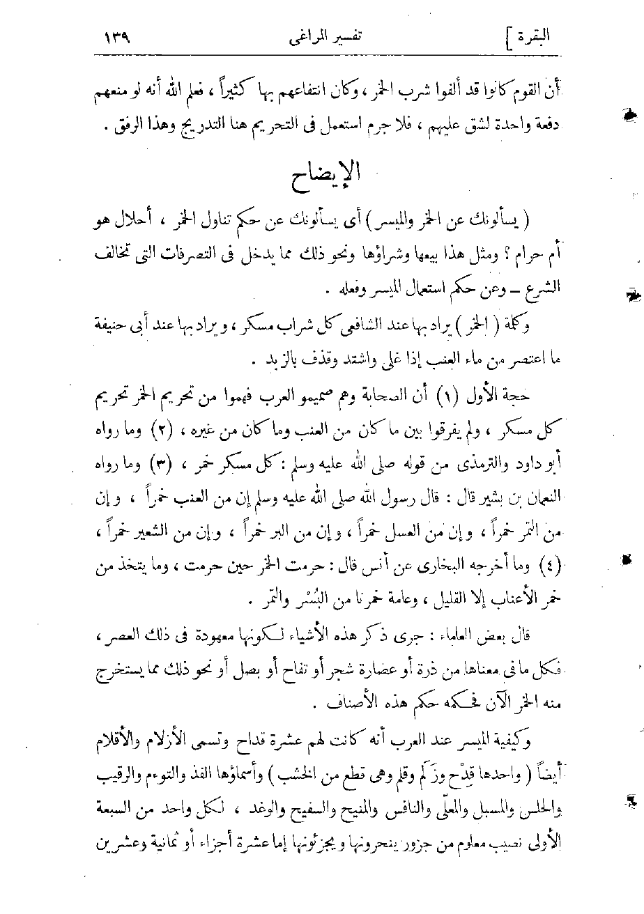 (يَسْئَلُونَكَ عَنِ الْخَمْرِ وَالْمَيْسِرِ) أي يسألونك عن حكم تناول الخمر، إحلال هو أم حرام؟ ومثل هذا بيعها وشراؤها ونحو ذلك مما يدخل في التصرفات التي تخالف الشرع- وعن حكم استعمال الميسر وفعله.