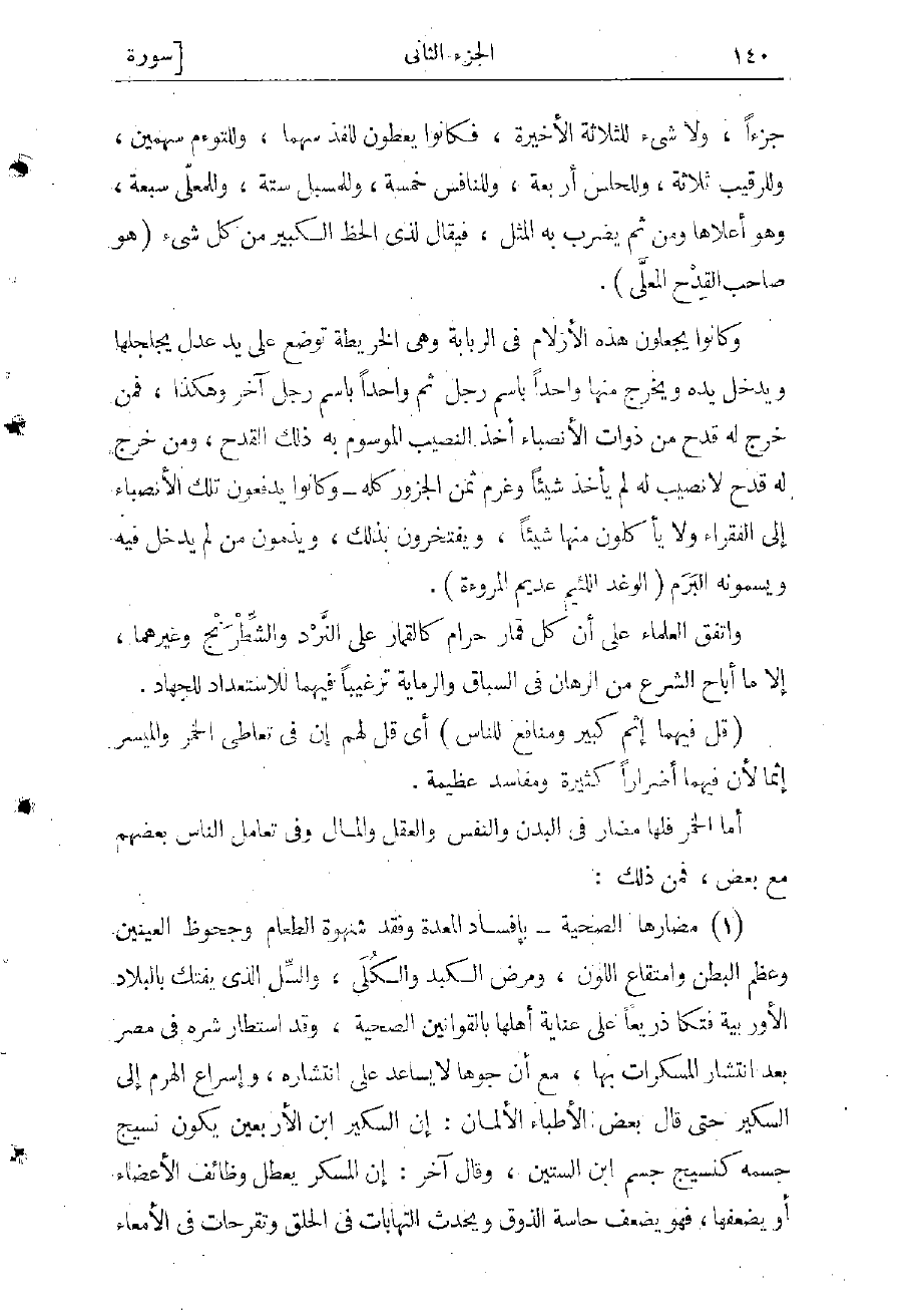 (1) مضارها الصحية- بإفساد المعدة وفقد شهوة الطعام وجحوظ العينين وعظم البطن وامتقاع اللون، ومرض الكبد والكلى، والسل الذي يفتك بالبلاد الأوربية فتكا ذريعا على عناية أهلها بالقوانين الصحية، وقد استطار شره في مصر بعد انتشار المسكرات بها، مع أن جوها لا يساعد على انتشاره، وإسراع الهرم إلى السكير حتى قال بعض الأطباء الألمان: إن السكير ابن الأربعين يكون نسيج جسمه كنسيج جسم ابن الستين، وقال آخر: إن المسكر يعطل وظائف الأعضاء أو يضعفها، فهو يضعف حاسة الذوق ويحدث التهابات في الحلق وتقرّحات في الأمعاء وتمددا في الكبد ويولد