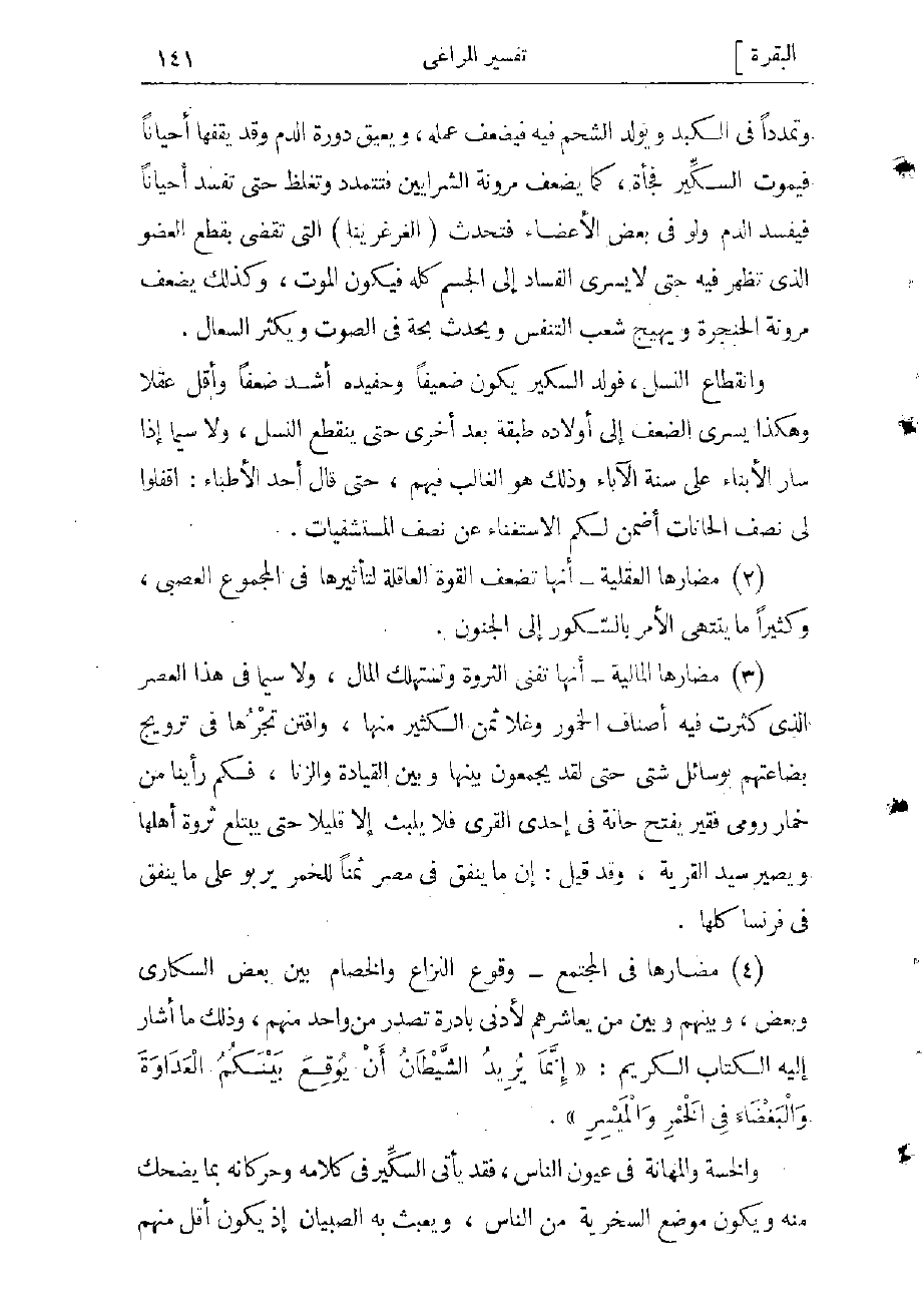وانقطاع النسل، فولد السكير يكون ضعيفا وحفيده أشد ضعفا وأقل عقلا وهكذا يسرى الضعف إلى أولاده طبقة بعد أخرى حتى ينقطع النسل، ولا سيما إذا سار الأبناء على سنة الآباء وذلك هو الغالب فيهم، حتى قال أحد الأطباء: اقفلوا لى نصف الخانات أضمن لكم الاستغناء عن نصف المستشفيات.
