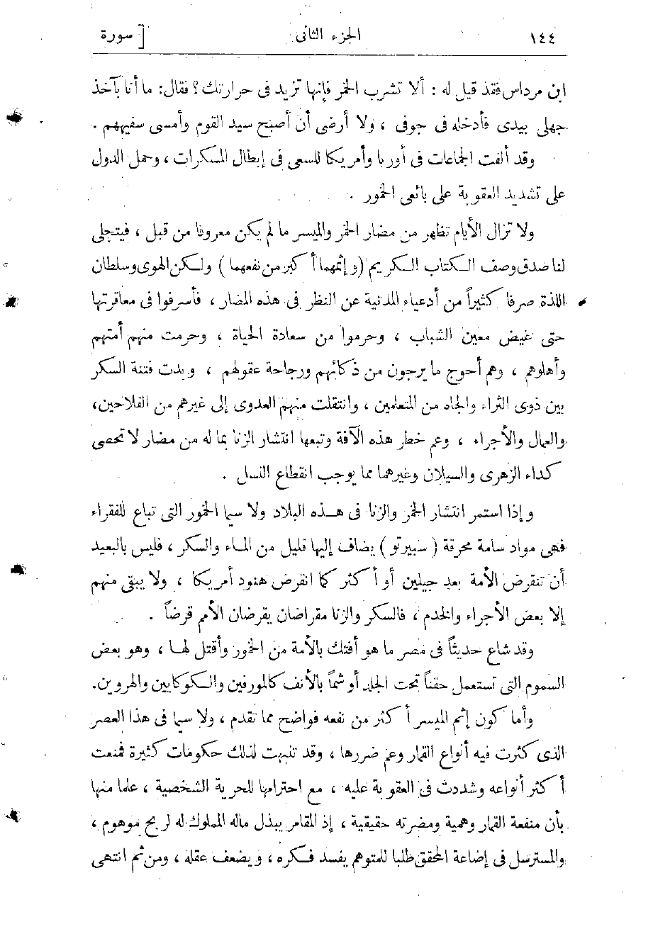 ولا تزال الأيام تظهر من مضارّ الخمر والميسر ما لم يكن معروفا من قبل، فيتجلى لنا صدق وصف الكتاب الكريم (وَإِثْمُهُما أَكْبَرُ مِنْ نَفْعِهِما) ولكن الهوى وسلطان اللذة صرفا كثيرا من أدعياء المدنية عن النظر في هذه المضار، فأسرفوا في معاقرتها حتى غيض معين الشباب، وحرموا من سعادة الحياة، وحرمت منهم أمتهم وأهلوهم، وهم أحوج ما يرجون من ذكائهم ورجاحة عقولهم، وبدت فتنة السكر بين ذوى الثراء والجاه من المتعلمين، وانتقلت منهم العدوى إلى غيرهم من الفلاحين، والعمال والأجراء، وعم خطر هذه الآفة وتبعها انتشار الزنا بما له من مضارّ لا تحصى كداء الزهري والسيلان وغيرهما مما يوجب انقطاع النسل.