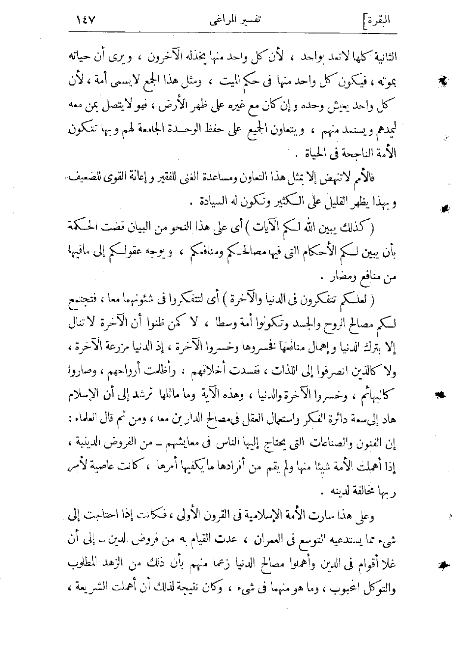وهذه الآية وما ماثلها ترشد إلى أن الإسلام هاد إلى سعة دائرة الفكر واستعمال العقل فى مصالح الدارين معا، ومن ثم قال العلماء إن الفنون والصناعات التي يحتاج إليها الناس فى معايشهم- من الفروض الدينية، إذا أهملت الأمة شيئا منها ولم يقم من أفرادها من يكفيهم أمرها، كانت عاصية لأمر ربها مخالفة لدينه.