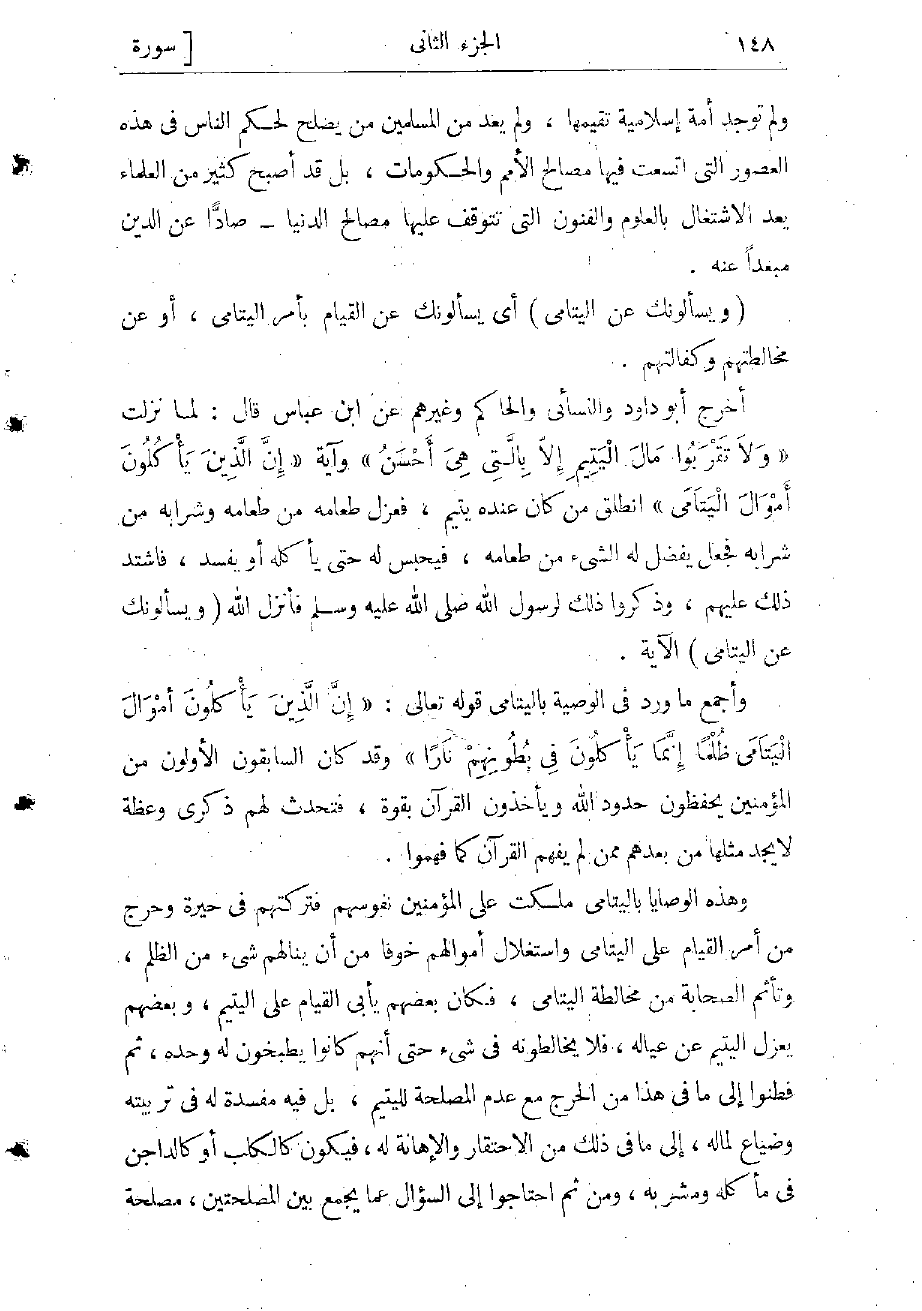 وآية «إِنَّ الَّذِينَ يَأْكُلُونَ أَمْوالَ الْيَتامى» انطلق من كان عنده يتيم، فعزل طعامه من طعامه وشرابه من شرابه فجعل يفضل له الشيء من طعامه، فيحبس له حتى يأكله أو يفسد، فاشتد ذلك عليهم، وذكروا ذلك لرسول الله صلى الله عليه وسلم فأنزل الله (وَيَسْئَلُونَكَ عَنِ الْيَتامى) الآية.