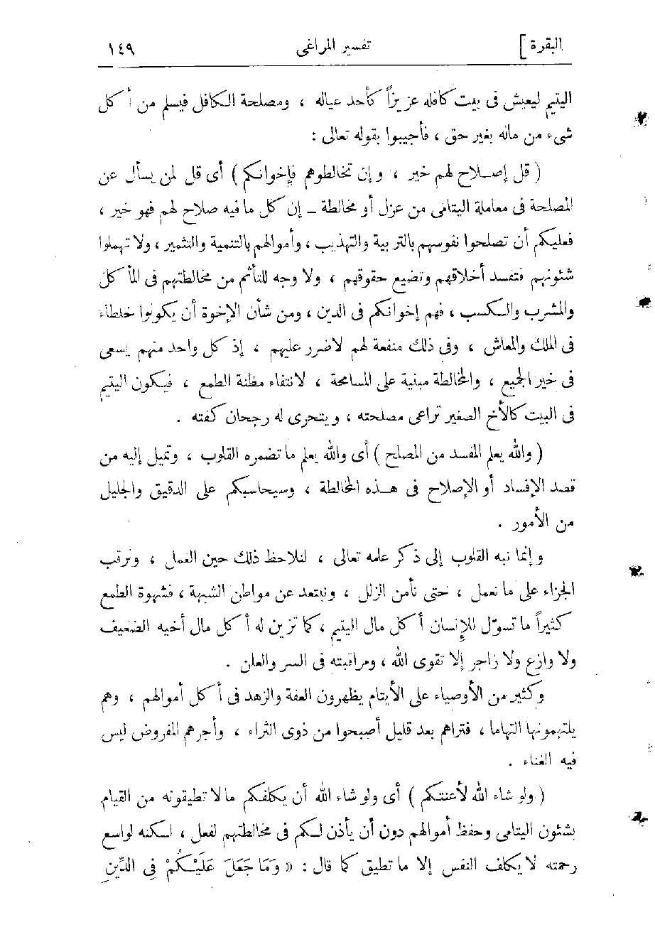 (قُلْ إِصْلاحٌ لَهُمْ خَيْرٌ، وَإِنْ تُخالِطُوهُمْ فَإِخْوانُكُمْ) أي قل لمن يسأل عن المصلحة فى معاملة اليتامى من عزل أو مخالطة- إن كل ما فيه صلاح لهم فهو خير، فعليكم أن تصلحوا نفوسهم بالتربية والتهذيب، وأموالهم بالتنمية والتثمير، ولا تهملوا شئونهم فتفسد أخلاقهم وتضيع حقوقهم، ولا وجه للتأثم من مخالطتهم في المأكل والمشرب والكسب، فهم إخوانكم في الدين، ومن شأن الإخوة أن يكونوا خلطاء في الملك والمعاش، وفي ذلك منفعة لهم لا ضرر عليهم، إذ كل واحد منهم يسعى في خير الجميع، والمخالطة مبنية على المسامحة، لانتفاء مظنّة الطمع، فيكون اليتيم في البيت كالأخ الصغير تراعى مصلحته، ويتحرى له رجحان كفته (وَاللَّهُ يَعْلَمُ الْمُفْسِدَ مِنَ الْمُصْلِحِ) أي والله يعلم ما تضمره القلوب، وتميل إليه من قصد الإفساد أو الإصلاح في هذه المخالطة، وسيحاسبكم على الدقيق والجليل من الأمور وإنما نبه القلوب إلى ذكر علمه تعالى، لتلاحظ ذلك حين العمل، وترقب الجزاء على ما تعمل، حتى تأمن الزلل، وتبتعد عن مواطن الشبهة، فشهوة الطمع كثيرا ما تسوّل للانسان أكل مال اليتيم، كما تزين له أكل مال أخيه الضعيف ولا وازع ولا زاجر إلا تقوى الله، ومراقبته في السر والعلن.