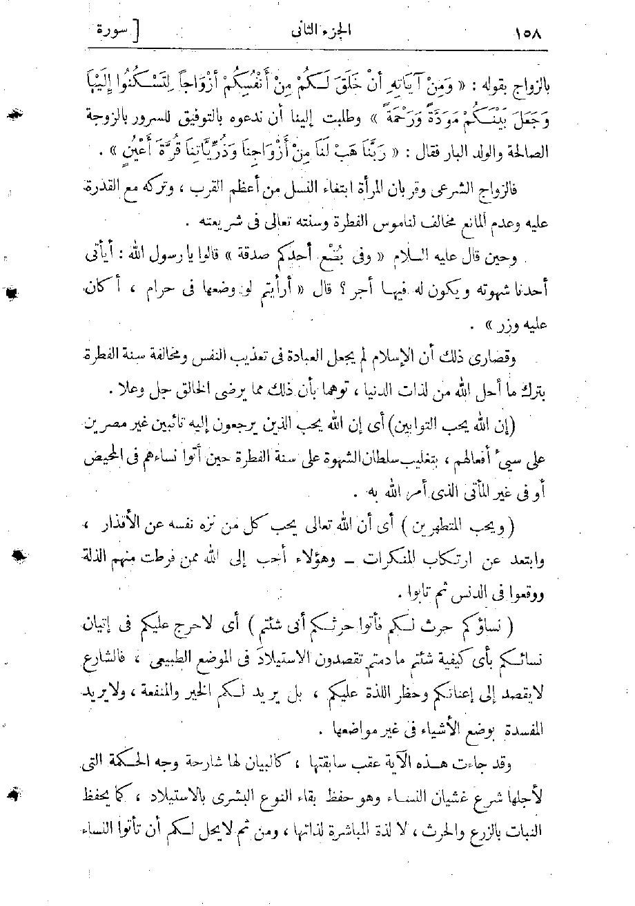 (وَيُحِبُّ الْمُتَطَهِّرِينَ) أي وإنه تعالى يحب كل من نزّه نفسه عن الأقذار، وابتعد عن ارتكاب المنكرات، وهؤلاء أحبّ إلى الله ممن فرطت منهم الزلة ووقعوا في الدنس ثم تابوا (نِساؤُكُمْ حَرْثٌ لَكُمْ فَأْتُوا حَرْثَكُمْ أَنَّى شِئْتُمْ) أي لا حرج عليكم في إتيان نسائكم بأى كيفية شئتم ما دمتم تقصدون الاستيلاد في الموضع الطبيعي، فالشارع لا يقصد إلى إعناتكم وحظر اللذة عليكم، بل يريد لكم الخير والمنفعة، ولا يريد المفسدة بوضع الأشياء فى غير مواضعها.