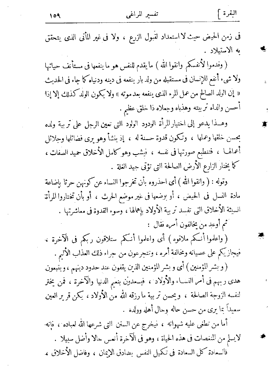 وقوله: (وَاتَّقُوا اللَّهَ) أي واحذروه بأن تخرجوا النساء عن كونهنّ حرثا بإضاعة مادة النسل في الحيض، أو بوضعها في غير موضع الحرث، أو بأن تختاروا المرأة السيئة الأخلاق التي تفسد تربية الأولاد بإهمالها، وسوء القدوة في معاشرتها.