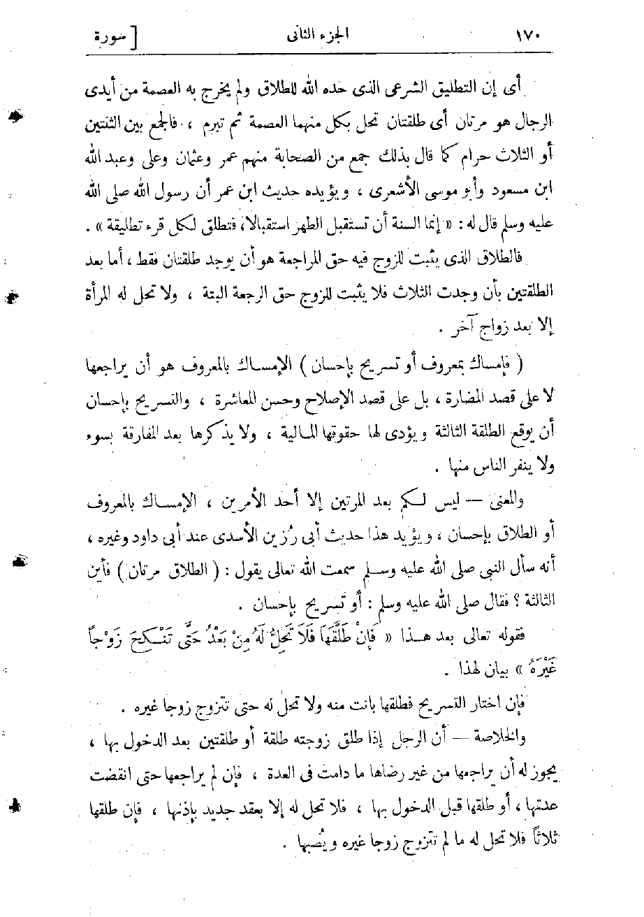 (الطَّلاقُ مَرَّتانِ) أي إن التطليق الشرعي الذي حده الله للطلاق ولم يخرج به العصمة من أيدى الرجال هو مرتان: أي طلقتان تحلّ بكل منهما العصمة ثم تبرم، فالجمع بين الثنتين أو الثلاث حرام كما قال بذلك جمع من الصحابة، منهم عمر وعثمان وعلىّ وعبد الله ابن مسعود وأبو موسى الأشعري، ويؤيده