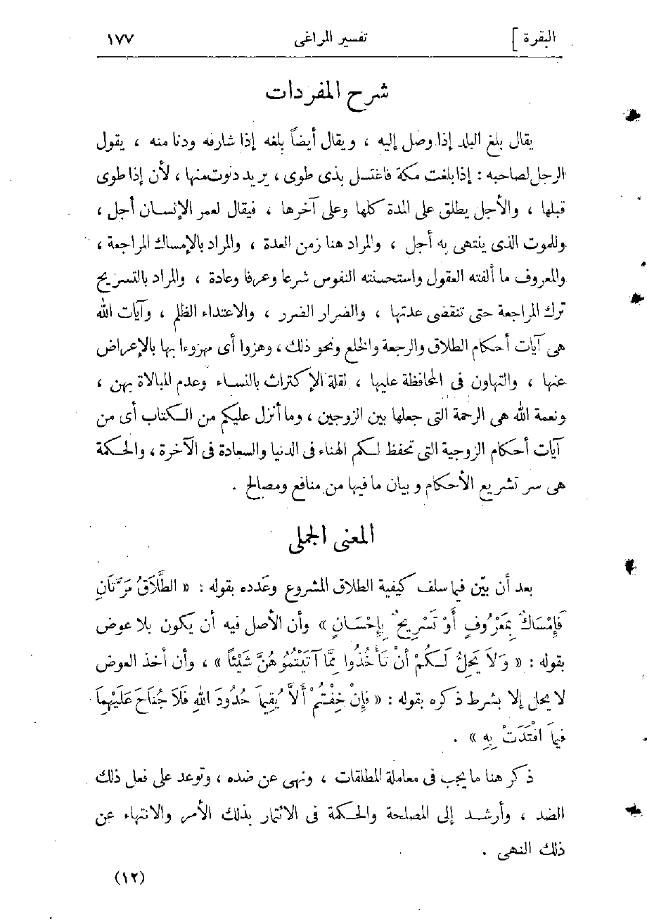 يقال بلغ البلد: إذا وصل إليه، ويقال أيضا بلغه إذا شارفه ودنا منه، يقول الرجل لصاحبه: إذا بلغت مكة فاغتسل بذي طوى، يريد دنوت منها، لأن ذا طوى قبلها، والأجل يطلق على المدة كلها وعلى آخرها، فيقال لعمر الإنسان أجل وللموت الذي ينتهى به أجل، والمراد هنا زمن العدة، والمراد بالإمساك المراجعة، والمعروف ما ألفته العقول واستحسنته النفوس شرعا وعرفا وعادة، والمراد بالتسريح ترك المراجعة حتى تنقضى عدتها والضرار الضرر، والاعتداء الظلم، وآيات الله هى آيات أحكام الطلاق والرجعة والخلع ونحو ذلك، وهزوا أي مهزوءا بها بالإعراض عنها، والتهاون في المحافظة عليها، لقلة الاكتراث بالنساء وعدم المبالاة بهن، ونعمة الله هى الرحمة التي جعلها بين الزوجين، وما أنزل عليكم من الكتاب أي من آيات أحكام الزوجية التي تحفظ لكم الهناء في الدنيا والسعادة في الآخرة، والحكمة هى سرّ تشريع الأحكام وبيان ما فيها من منافع ومصالح.
