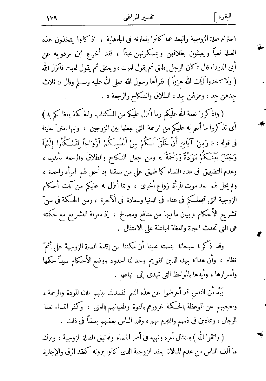فقد أخرج ابن مردويه عن أبي الدرداء قال: كان الرجل يطلق ثم يقول لعبت ويعتق، ثم يقول لعبت فأنزل الله (وَلا تَتَّخِذُوا آياتِ اللَّهِ هُزُواً) فقرأها رسول الله صلى الله عليه وسلم وقال «ثلاث جدّهن جد وهزلهنّ جدّ: الطلاق والنكاح والرجعة» .