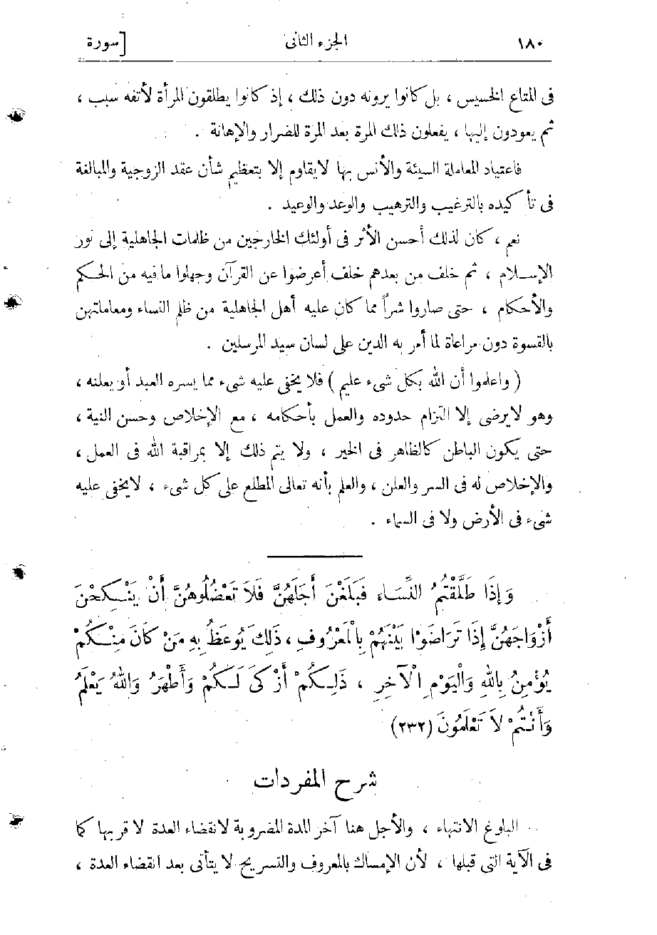 البلوغ الانتهاء، والأجل هنا آخر المدة المضروبة لانقضاء العدة لا قربها كما في الآية التي قبلها، لأن الإمساك بالمعروف والتسريح لا يتأتي بعد انقضاء العدة إذا انقضاؤها إمضاء للتسريح فلا محل معه للتخيير، والتخيير يستمر إلى قرب الانقضاء والمذكور هنا