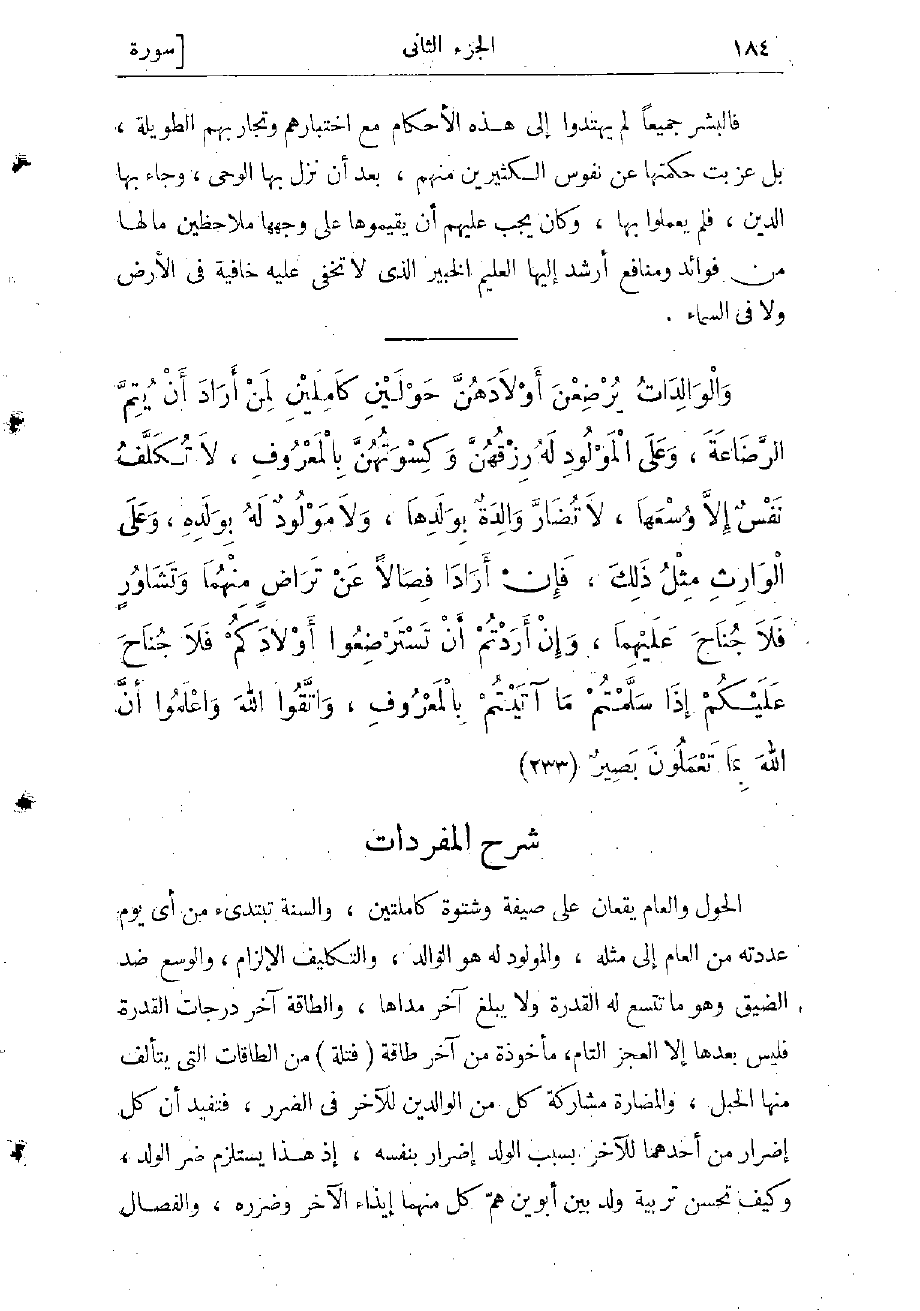 الحول والعام يقعان على صيفة وشتوة كاملتين، والسنة تبتدئ من أىّ يوم عددته من العام إلى مثله، والمولود له هو الوالد، والتكليف الإلزام، والوسع ضد الضيق وهو ما تتسع له القدرة ولا يبلغ آخر مداها، والطاقة آخر درجات القدرة، فليس بعدها إلا العجز التام، مأخوذة من آخر طاقة (فتلة) من الطاقات التي يتألف منها الحبل، والمضارة مشاركة كل من الوالدين للآخر في الضرر، فتفيد أن كل إضرار من أحدهما للآخر بسبب الولد إضرار بنفسه، إذ هذا يستلزم ضر الولد وكيف تحسن تربية ولد بين أبوين همّ كل منهما إيذاء الآخر وضرره، والفصال