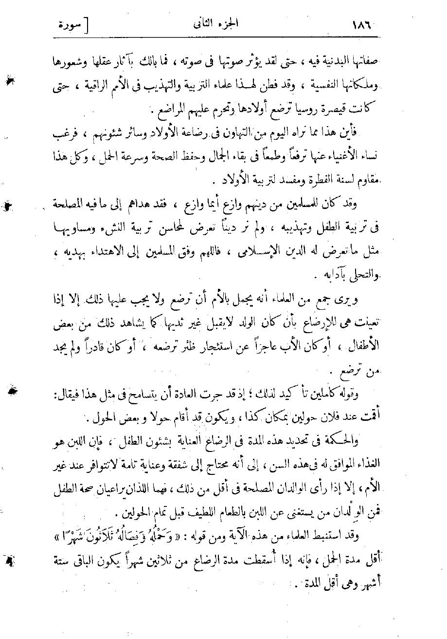 فأين هذا مما نراه اليوم من التهاون في رضاعة الأولاد وسائر شئونهم، فقد رغب نساء الأغنياء عنها ترفعا وطمعا في بقاء الجمال وحفظ الصحة وسرعة الحمل، وكل هذا مقاوم لسنة الفطرة ومفسد لتربية الأولاد.