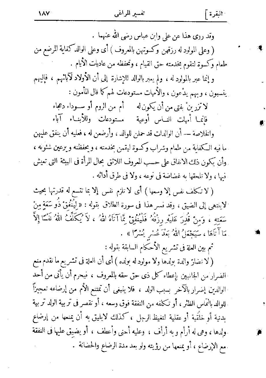 والخلاصة- إن الوالدات قد حملن للوالد، وأرضعن له، فعليه أن ينفق عليهن ما فيه الكفاية من طعام وشراب وكسوة ليقمن بخدمته، ويحفظنه ويرعين شئونه، وأن يكون ذلك الإنفاق بحسب المعروف اللائق بحال المرأة في البيئة التي تعيش فيها، ولا تلحقها بها غضاضة في نوعه، ولا في طرق أدائه.