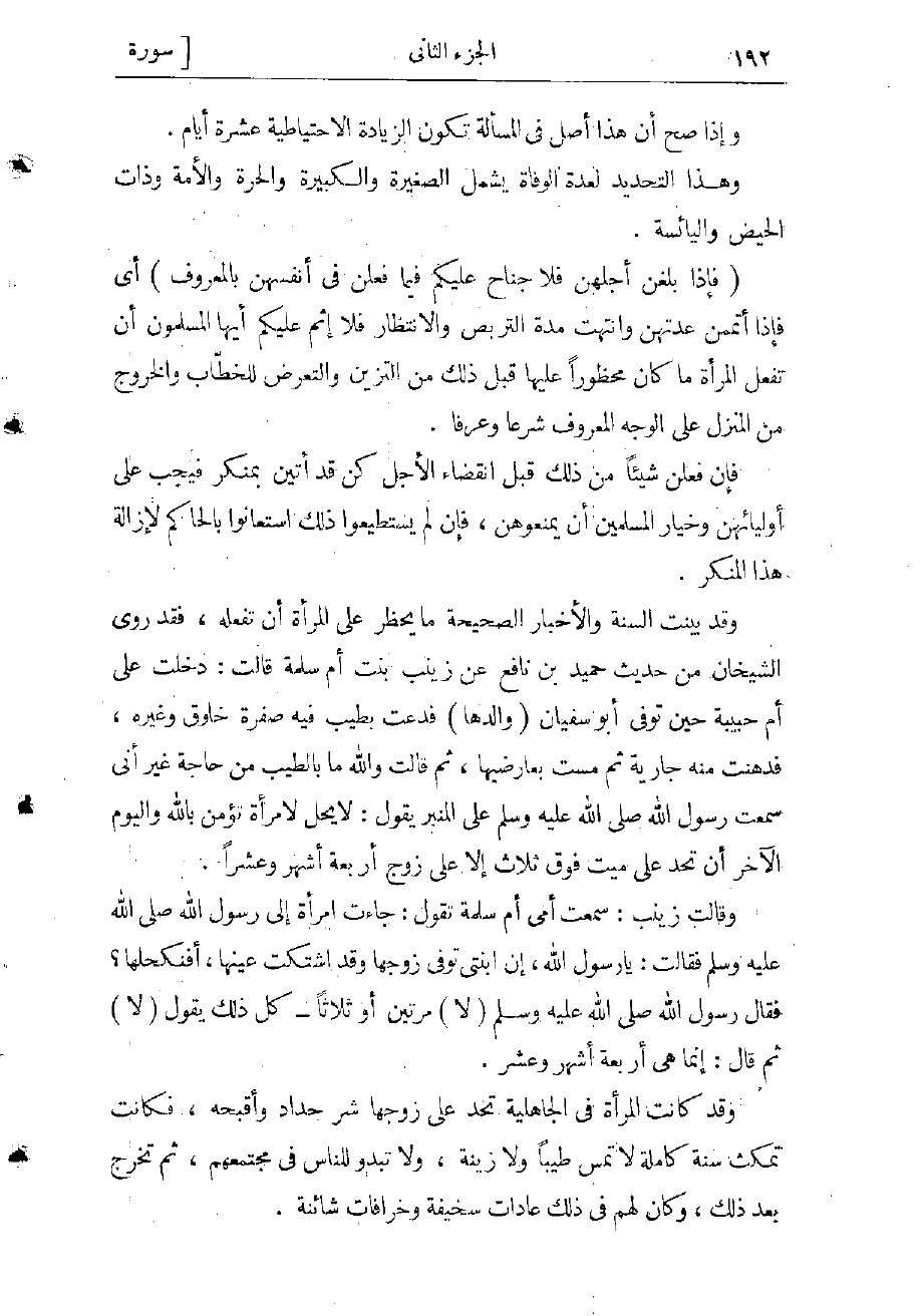 حديث حميد بن نافع عن زينب بنت أم سلمة قالت: دخلت على أم حبيبة حين توفى أبو سفيان (والدها) فدعت بطيب فيه صفرة خلوق وغيره، فدهنت منه جارية ثم مست بعارضيها، ثم قالت والله ما بالطيب من حاجة غير أني سمعت رسول الله صلى الله عليه وسلم على المنبر يقول: «لا يحلّ لامرأة تؤمن بالله واليوم الآخر أن تحدّ على ميت فوق ثلاث إلا على زوج أربعة أشهر وعشرا» .