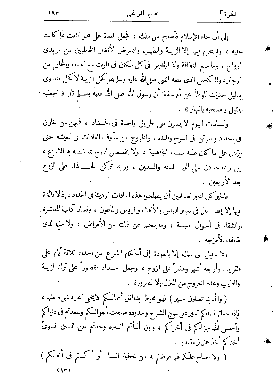 فالخير كل الخير للمسلمين أن يصلحوا هذه العادات الرديئة في الحداد، إذ لا فائدة فيها إلا إفناء المال في تغيير اللباس والأثاث والرياش والماعون، وفساد آداب المعاشرة والشقاء في أحوال المعيشة، وما ينجم عن ذلك من الأمراض، ولا سيما لدى ضعفاء الأمزجة.