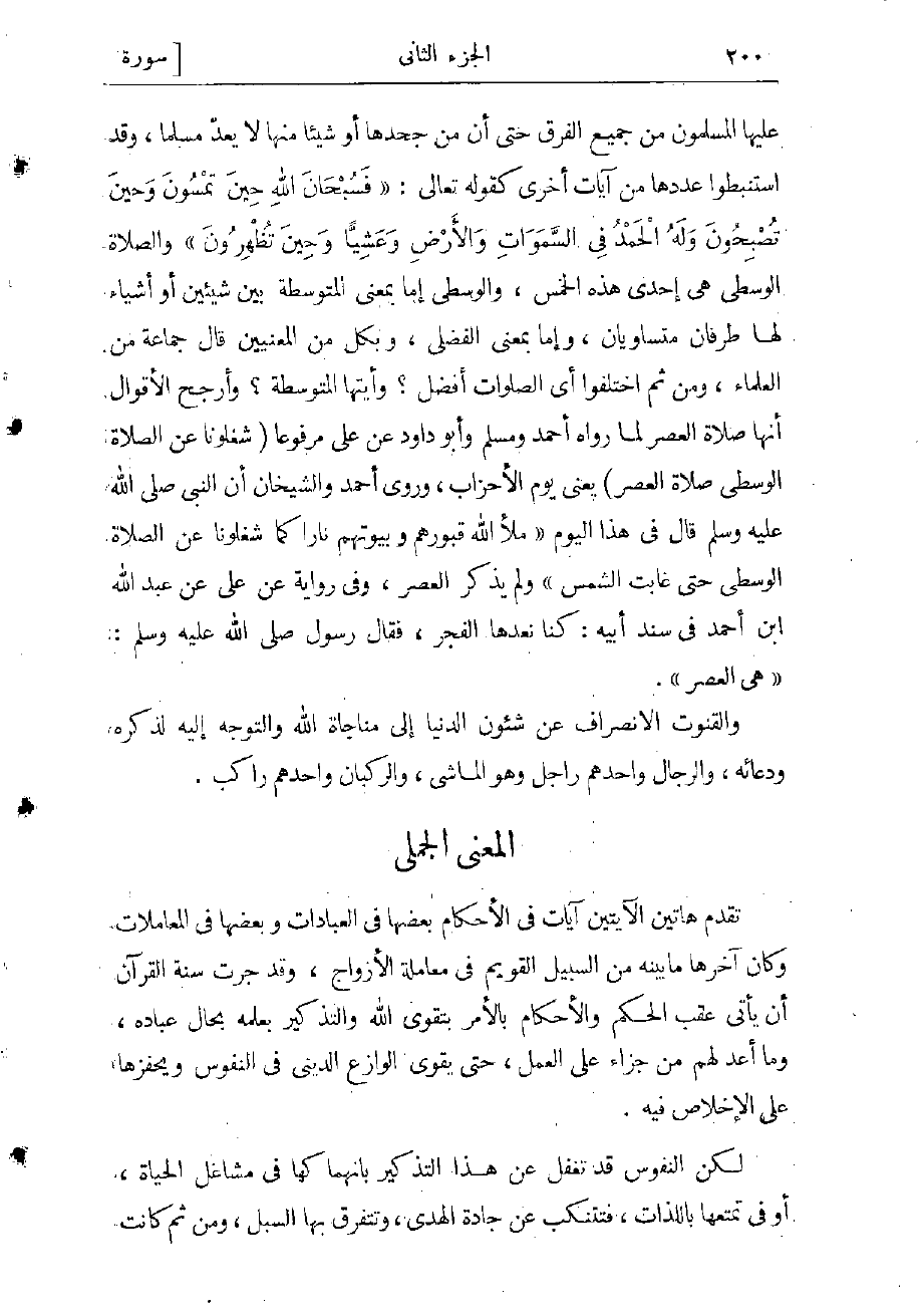 عليها المسلمون من جميع الفرق، حتى إن من جحدها أو شيئا منها لا يعدّ مسلما، وقد استنبطوا عددها من آيات أخرى كقوله تعالى: «فَسُبْحانَ اللَّهِ حِينَ تُمْسُونَ وَحِينَ تُصْبِحُونَ. وَلَهُ الْحَمْدُ فِي السَّماواتِ وَالْأَرْضِ وَعَشِيًّا وَحِينَ تُظْهِرُونَ» والصلاة الوسطى: هى إحدى هذه الخمس، والوسطى: إما بمعنى المتوسطة بين شيئين أو أشياء لها طرفان متساويان، وإما بمعنى الفضلى، وبكل من المعنيين قال جماعة من العلماء، ومن ثم اختلفوا أىّ الصلوات أفضل؟ وأيتها المتوسطة؟ وأرجح الأقوال أنها صلاة العصر لما