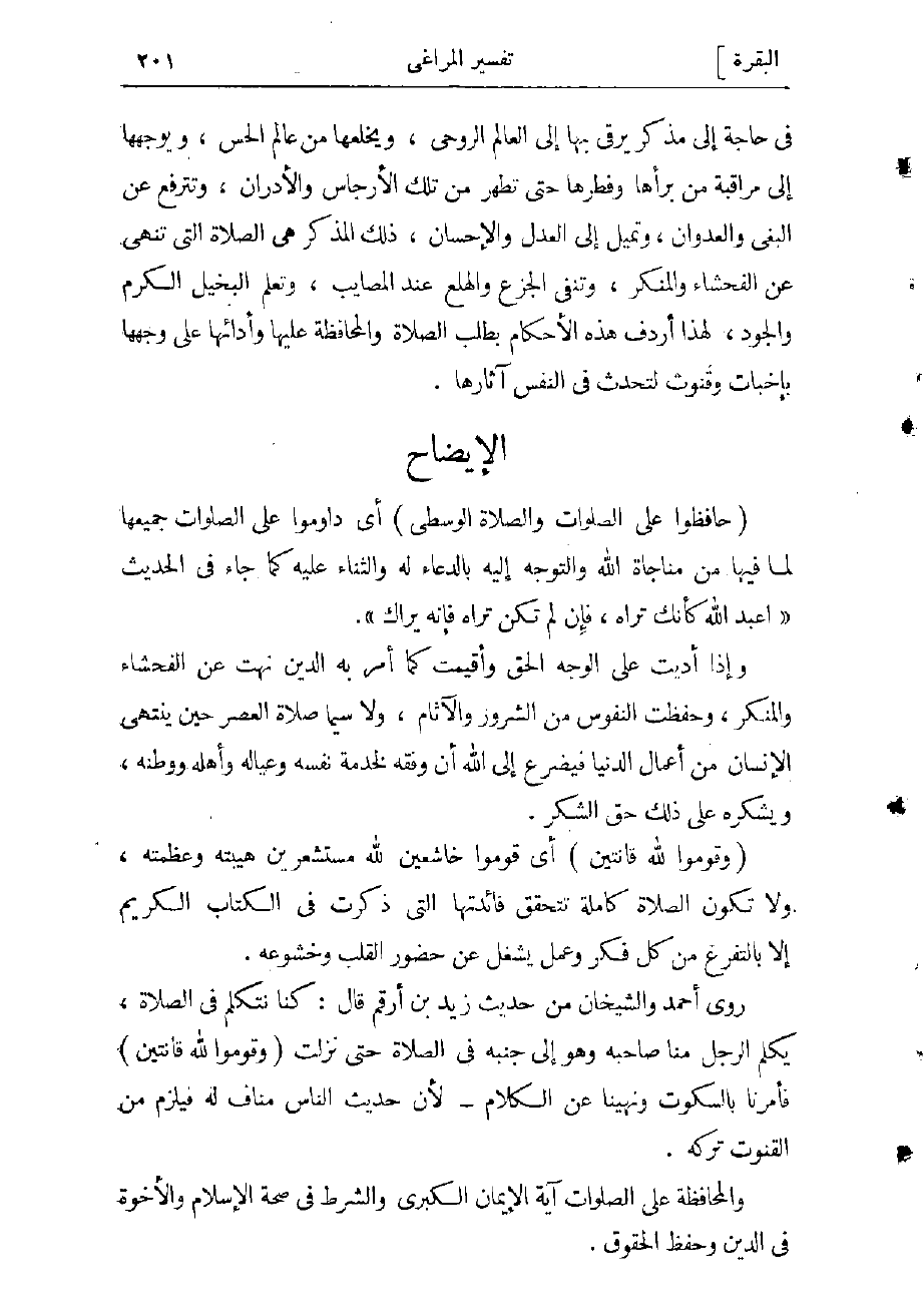 (وَقُومُوا لِلَّهِ قانِتِينَ) أي قوموا خاشعين لله مستشعرين هيبته وعظمته، ولا تكون الصلاة كاملة تتحقق فائدتها التي ذكرت في الكتاب الكريم إلا بالتفرغ من كل فكر وعمل يشغل عن حضور القلب وخشوعه.